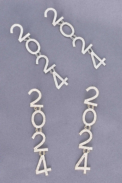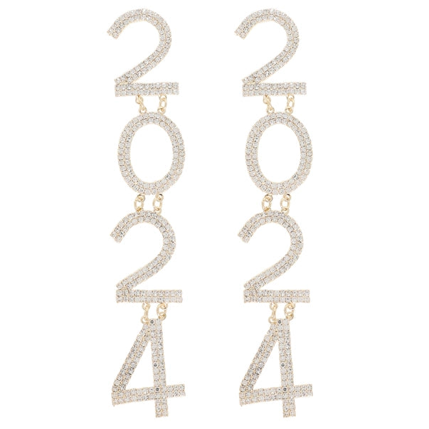 These stylish earrings feature 2024 lettering encrusted in beautiful crystals, perfect for ringing in the New Year. Enjoy a glamorous look with these lightweight and hypoallergenic earrings. HEIGHT: 4.6" WIDTH: 0.75"
