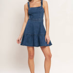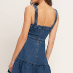 A washed denim mini dress featuring straight neckline, braided straps, ruffled hem and back zipper closure Details: Self : 99% Cotton 1% Spandex Size & Fit - Model is 5`8" And Wearing Size Small - Measurements Taken From Size Small - Approx. Length: 35"