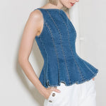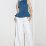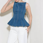 A washed denim top featuring wide neckline, sleeveless, peplum and back zipper closure Details: Self : 85% Cotton 5% Polyester 8% Viscose 2% Spandex Size & Fit - Model is 5`8" And Wearing Size Small - Measurements Taken From Size Small - Approx. Length: 24"