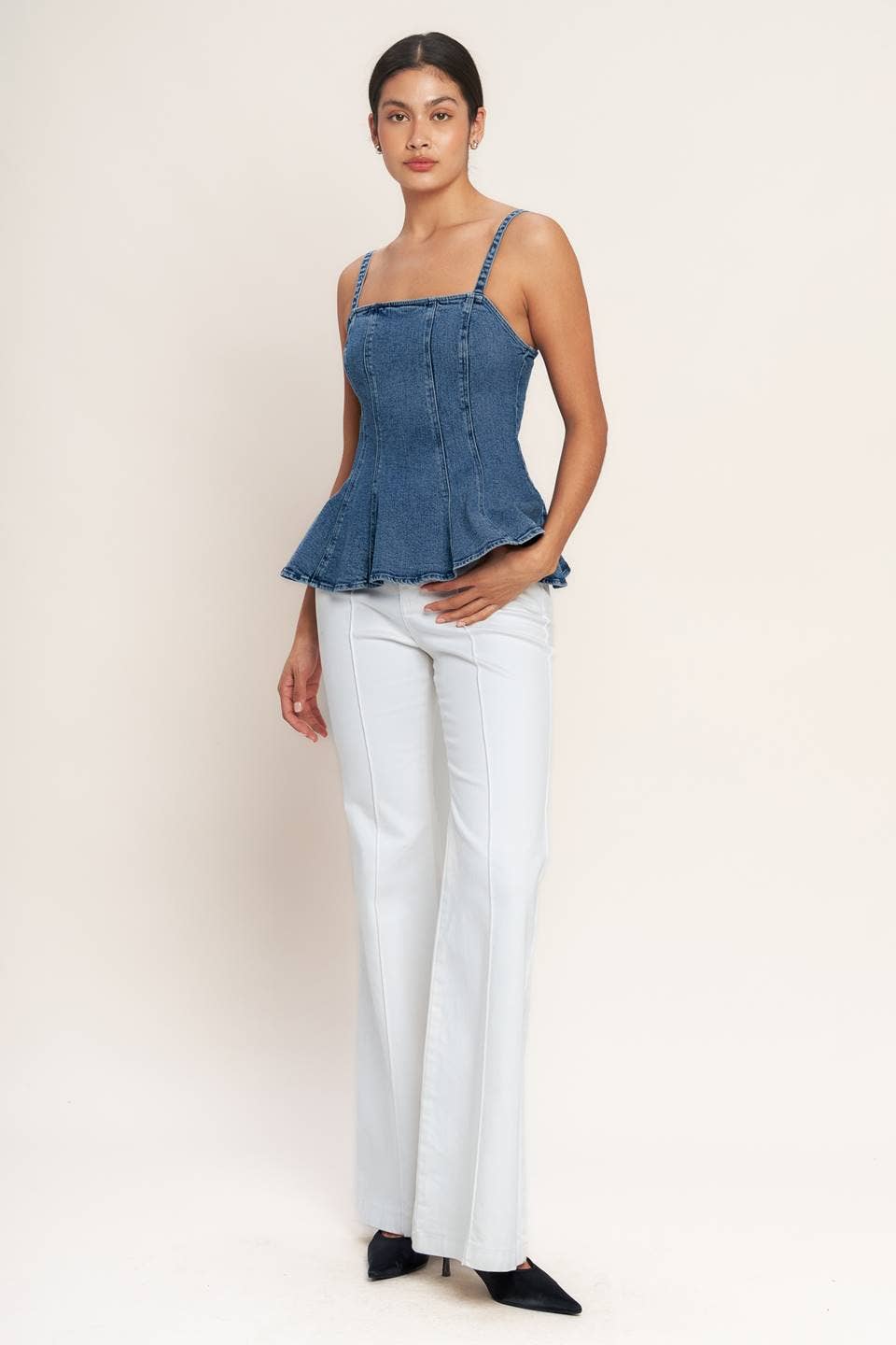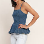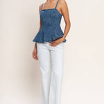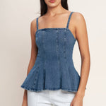 A washed denim top featuring straight neckline, straps, peplum and back zipper closure Details: Self : 99% Cotton 1% Spandex Size & Fit - Model is 5`8" And Wearing Size Small - Measurements Taken From Size Small - Approx. Length: 24"