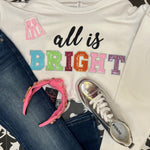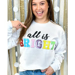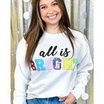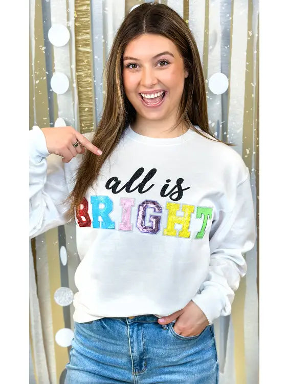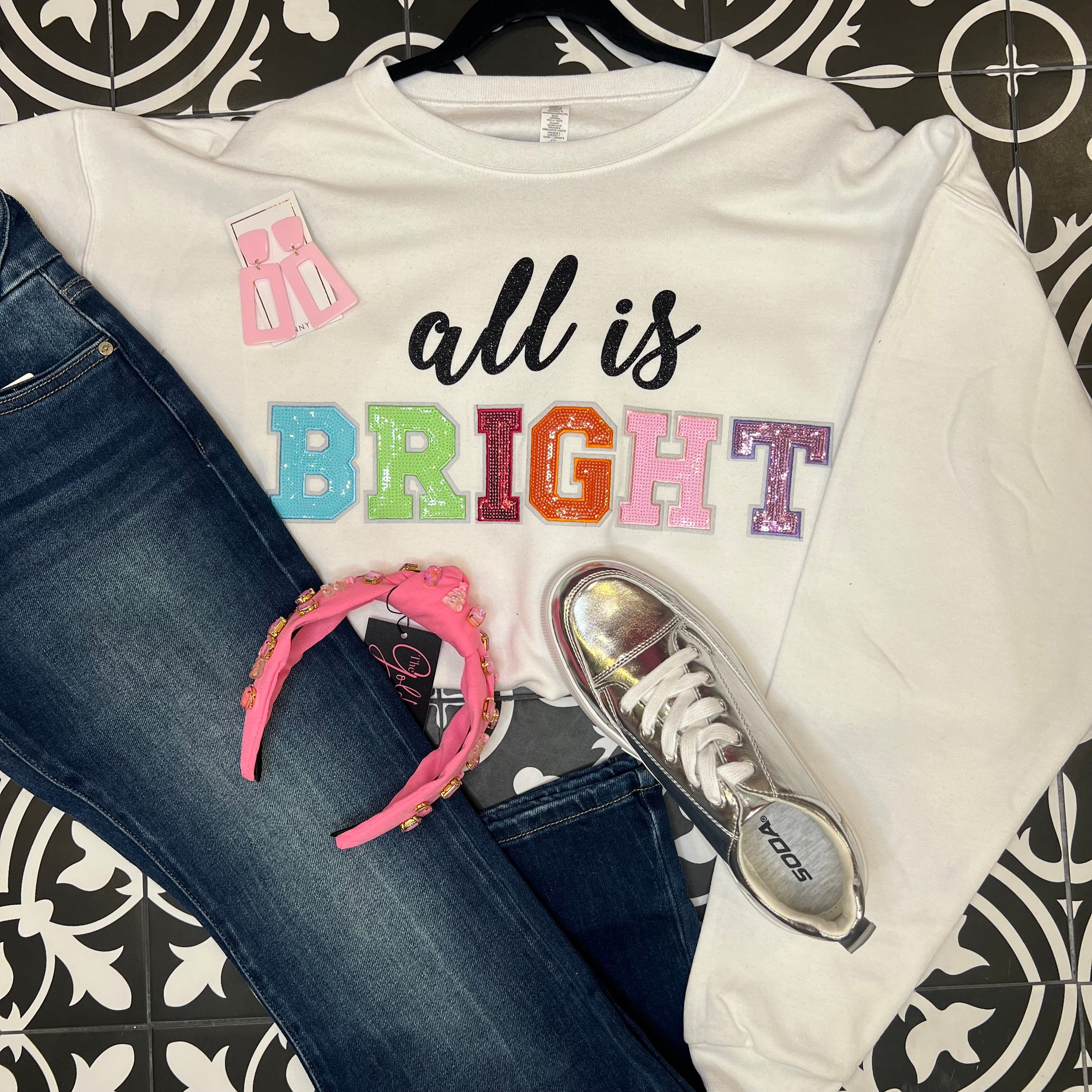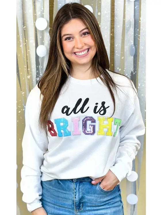Imagine wrapping yourself in this cheerful white sweater that captures the essence of the holiday season. With the words “ALL IS BRIGHT” sparkling in a delightful mix of glittery vinyl and colorful sequin patches, it’s impossible not to feel festive! This sweatshirt is perfect for everything from cozy nights watching holiday movies to festive gatherings with friends and family. The soft fabric keeps you comfy, while the eye-catching design adds a fun touch of holiday cheer to any outfit. It’s a go-to piece that will brighten your spirits and spread joy wherever you go!
