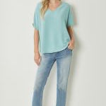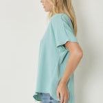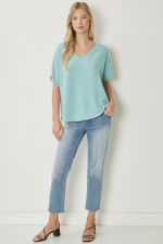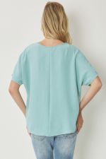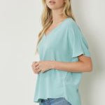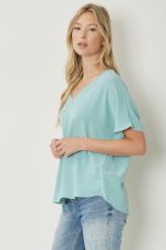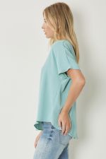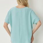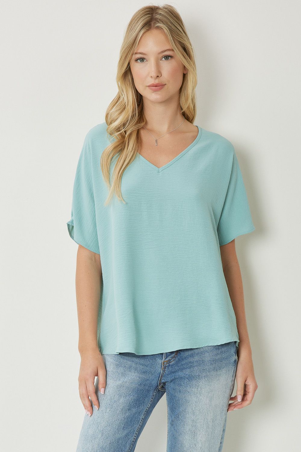 Solid v-neck top featuring asymmetric rounded hem detail. Unlined. Semi-sheer. Woven. Lightweight.