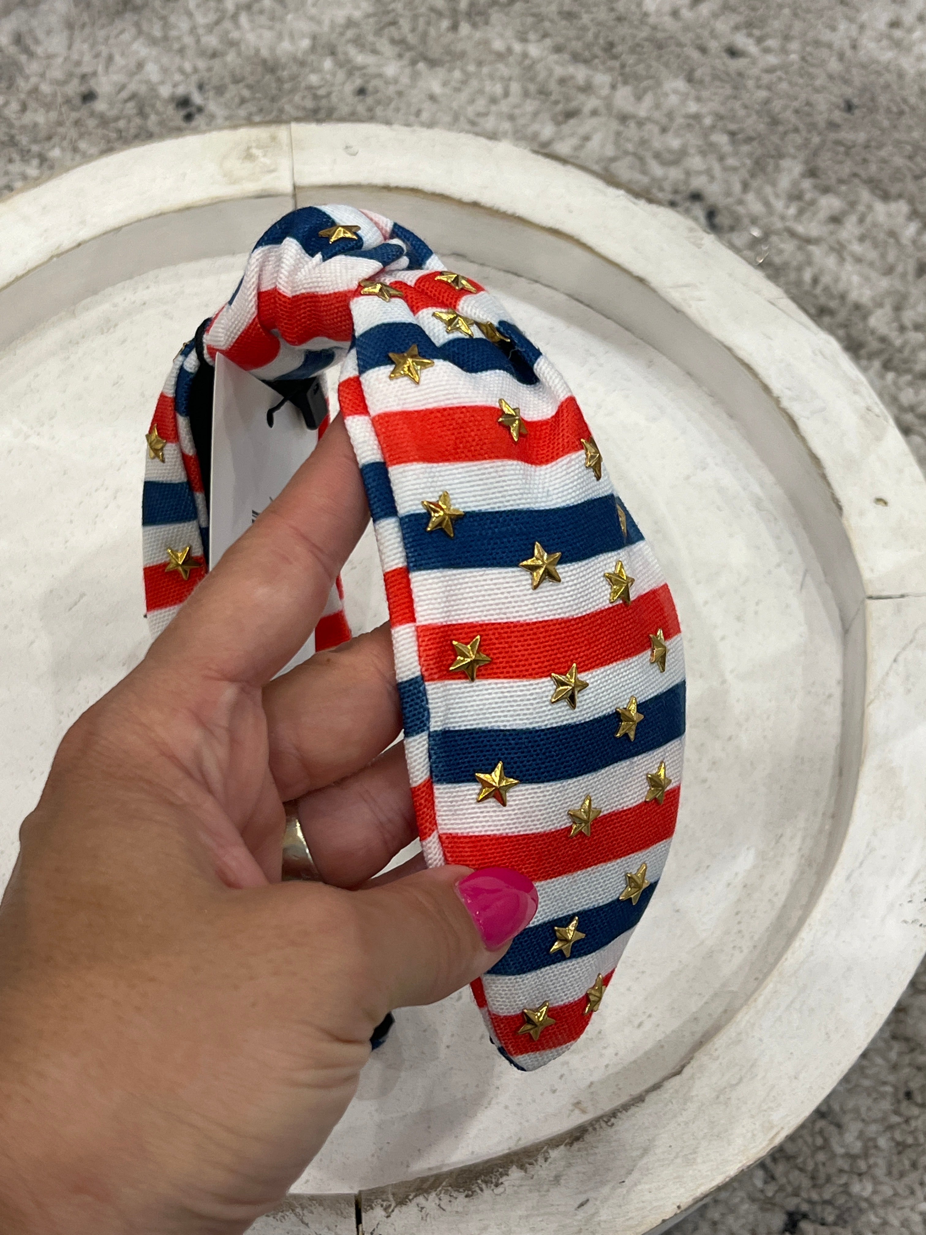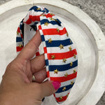 This red, white, and blue striped knot headband is a vibrant and patriotic accessory that celebrates the spirit of national pride, it features bold stripes in the iconic colors of the American flag, evoking a sense of unity and patriotism. Interwoven among the stripes are dazzling gold stars, which add a touch of glamour and whimsy to the headband. These shimmering stars catch the light with every movement, creating a captivating visual effect that enhances the overall aesthetic and adds a touch of sparkle to your look.