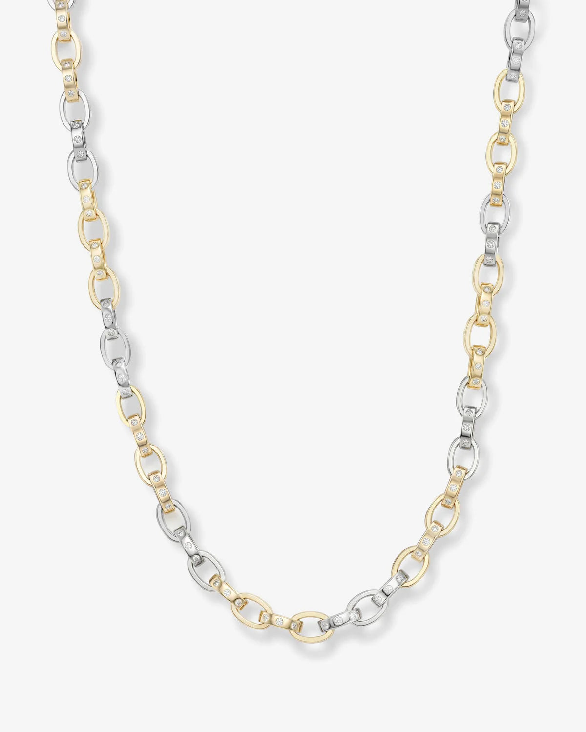 The chain link, Ashley-style. Polished metals and bezel-set round simulated diamonds bring a familiar edge to a classic chain silhouette. A little bit of everything, linked together.
