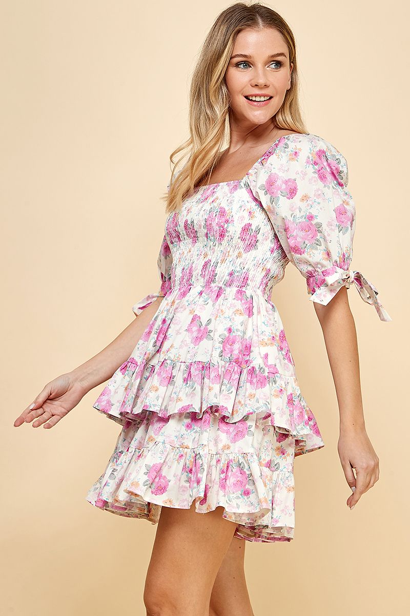 Floral printed smocked dress with puffed sleeves, delicate bow tie detail, and ruffled tiered skirt. Hidden zipper. Fabric content: 100% Cotton