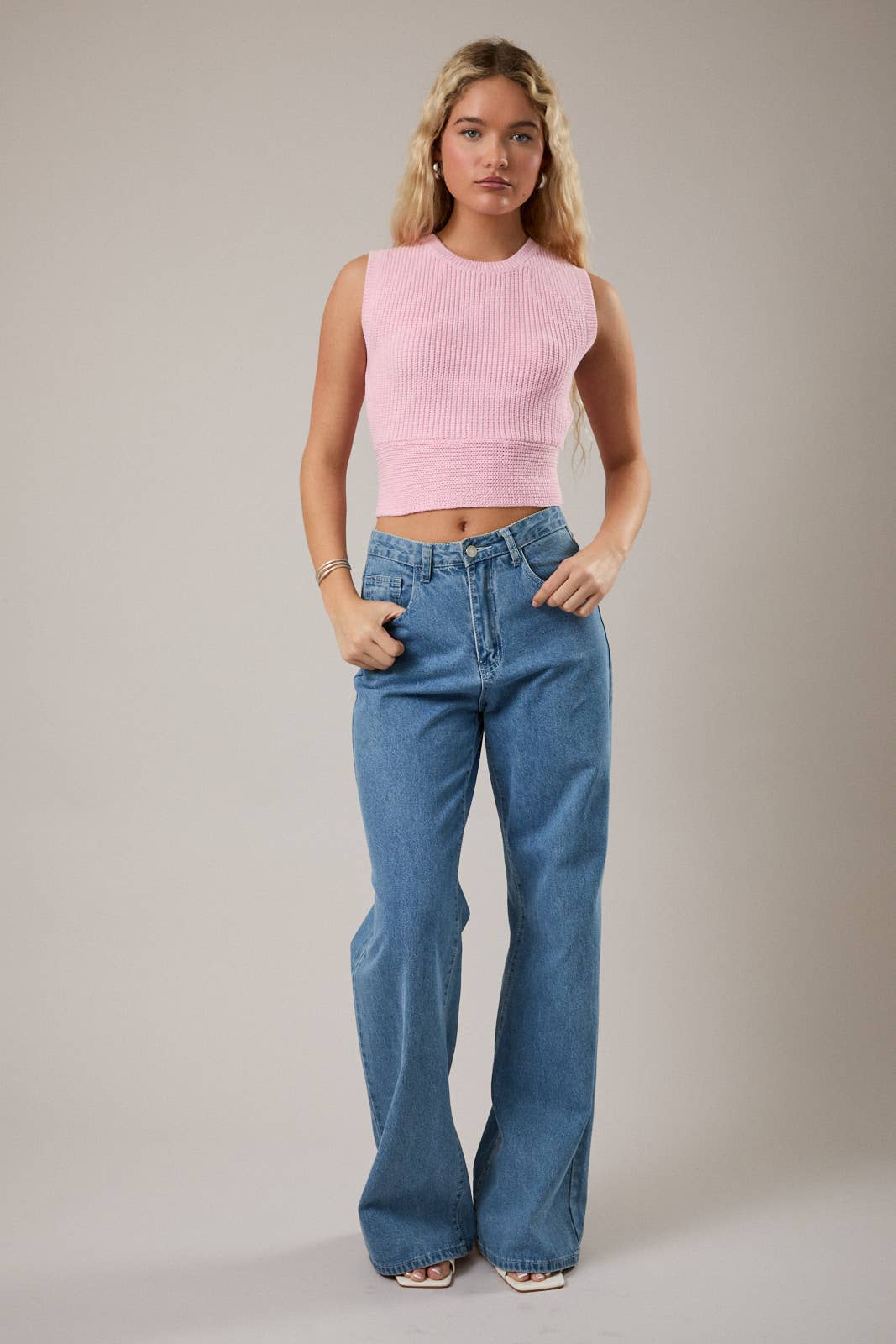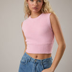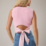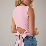 Sweet from the front and stunning from the back, this blush pink knit crop top is a total statement piece. Designed with a sleeveless silhouette and soft ribbed texture, it features a chic open-back cutout finished with an adjustable oversized bow tie for the perfect feminine touch. The cropped length pairs effortlessly with high-rise denim for a flirty, on-trend look.