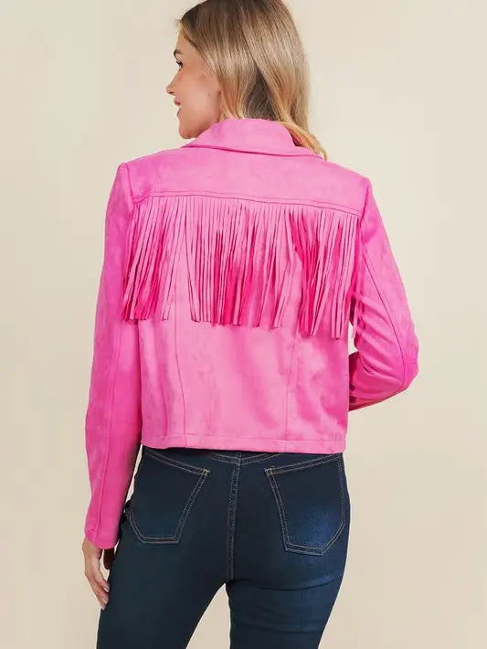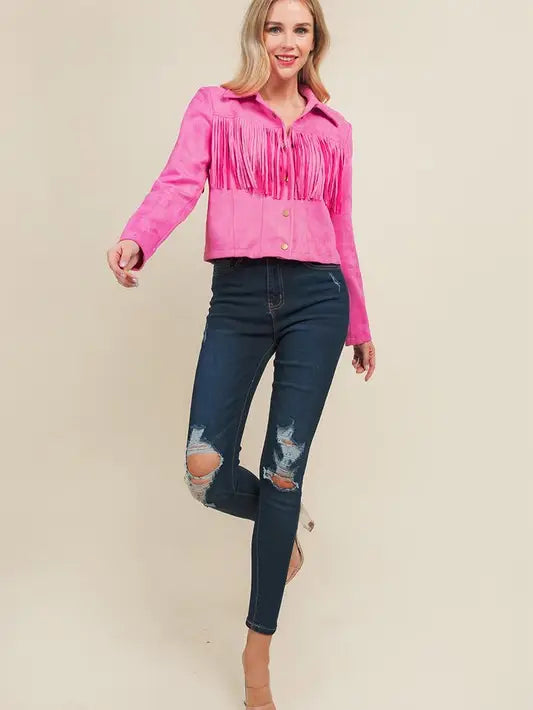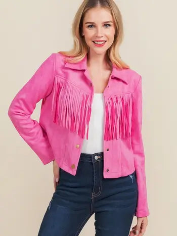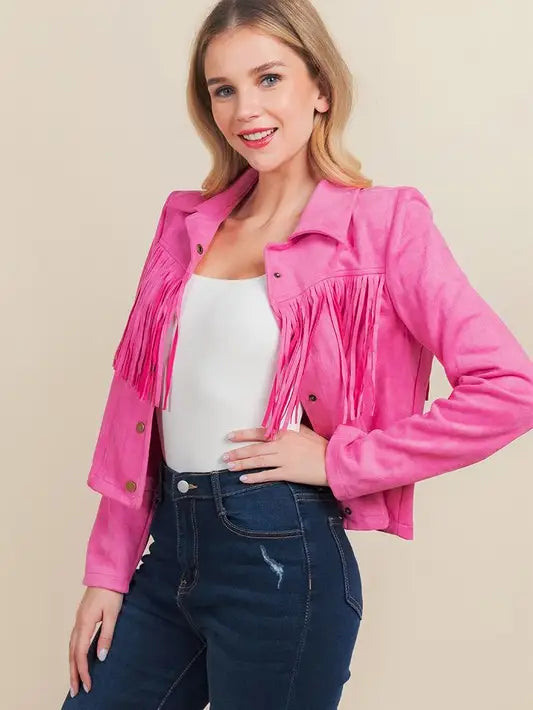 Suede jacket with fringe detail across front & back yoke. Snap button down the center front.