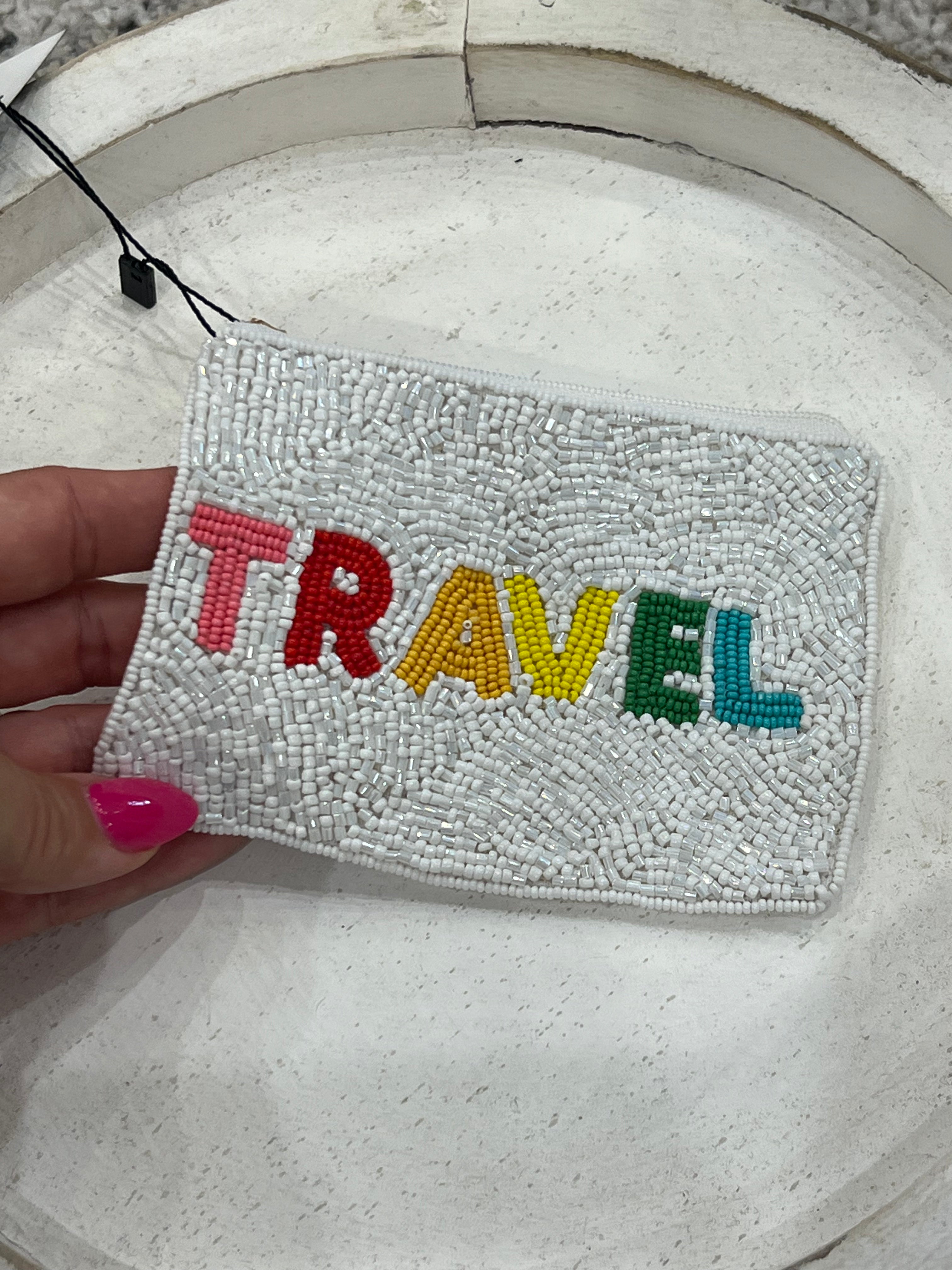 This white beaded coin purse is a chic and stylish accessory that combines classic elegance with a playful twist. Its pristine white exterior provides a timeless backdrop, while the intricate beadwork adds texture and character to the design. featured across the center of the purse, the word "Travel" is spelled out in colorful beads, with each letter adorned in a different hue. This vibrant arrangement adds a dynamic and eye-catching element to the accessory, capturing the excitement and adventure of travel.