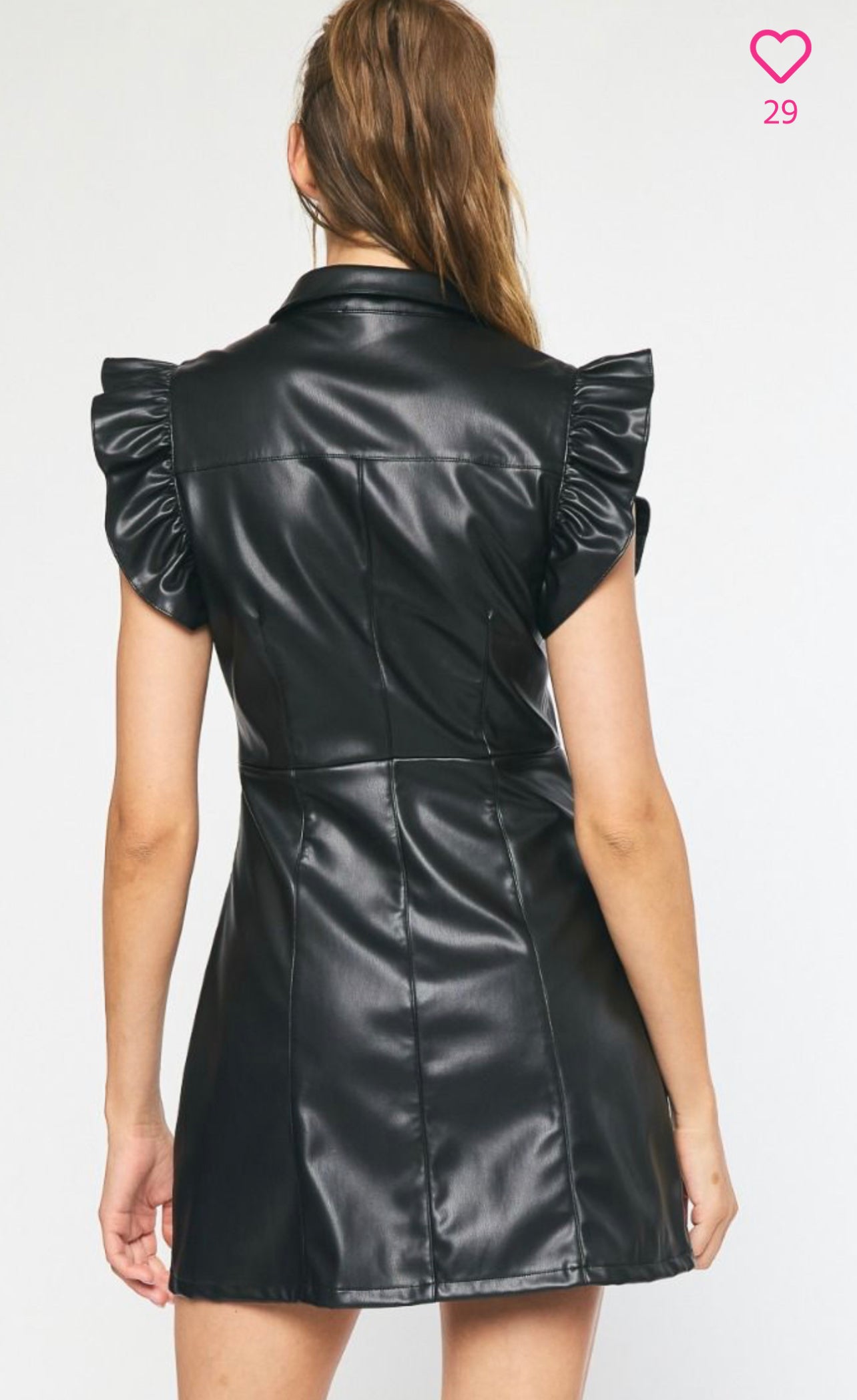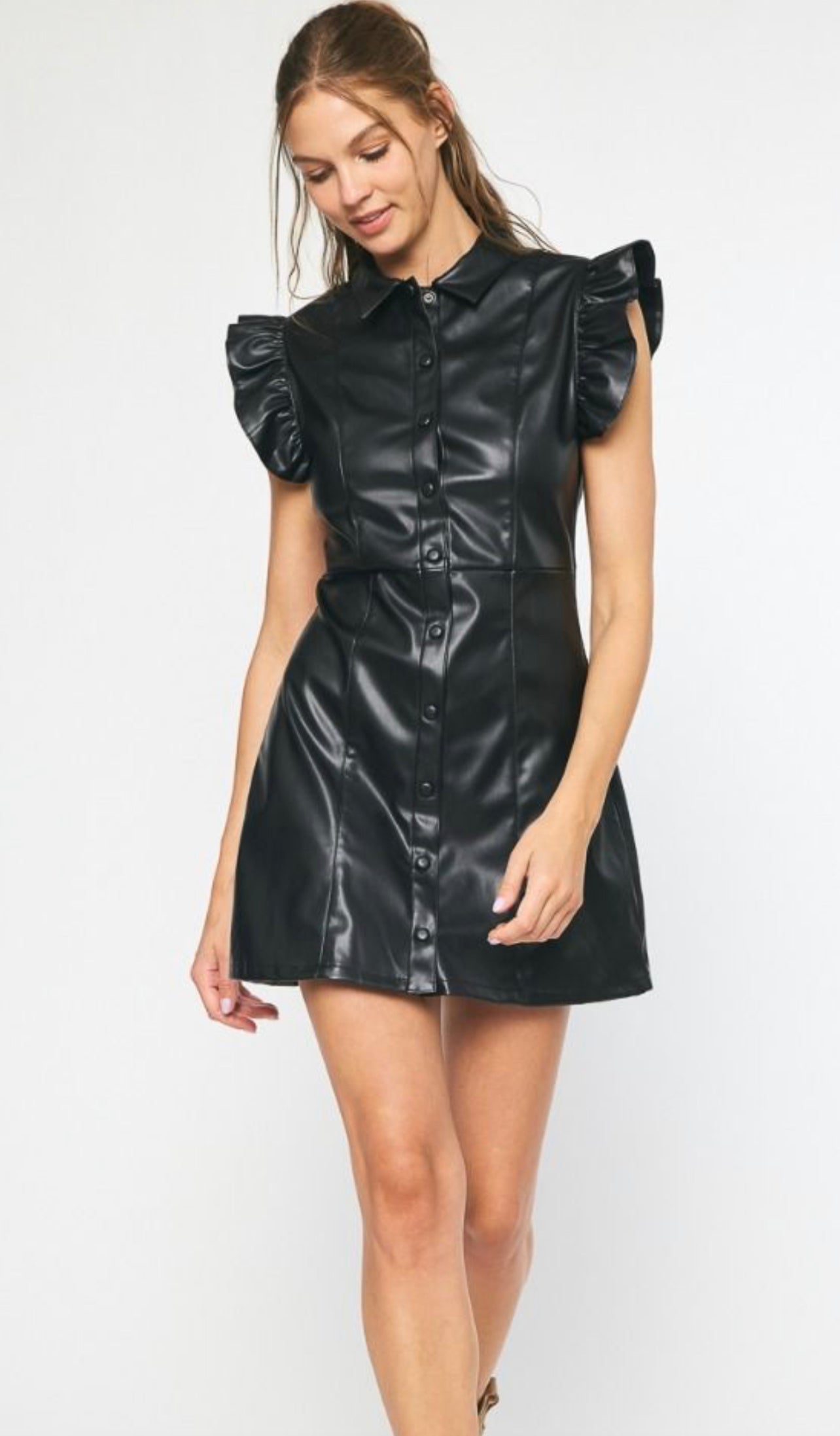 FAUX LEATHER BUTTON UP COLARD SLEEVELES MINI DRESS, FEATURING RUFFLED DETAIL AT SHOULDERS UNLINED AND WOVEN, BUT NOT SHEER AND LIGHTWEIGHT.