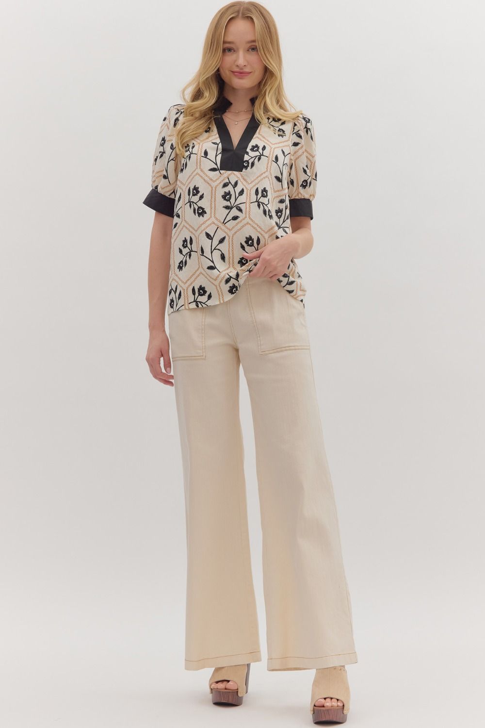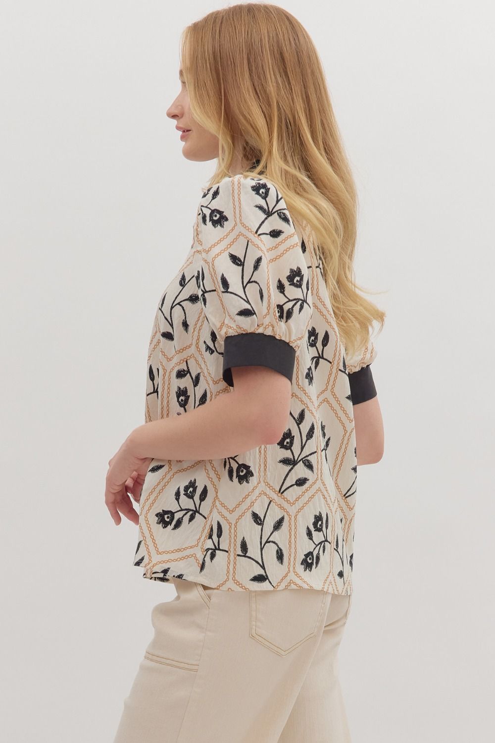 Bring effortless charm to your wardrobe with the Bloom & Bold Blouse. Featuring a striking floral pattern framed in soft geometric lines, this blouse blends timeless elegance with a modern twist. The contrasting neckline and sleeve cuffs add a polished detail, while the relaxed fit keeps it chic and comfortable all day long.