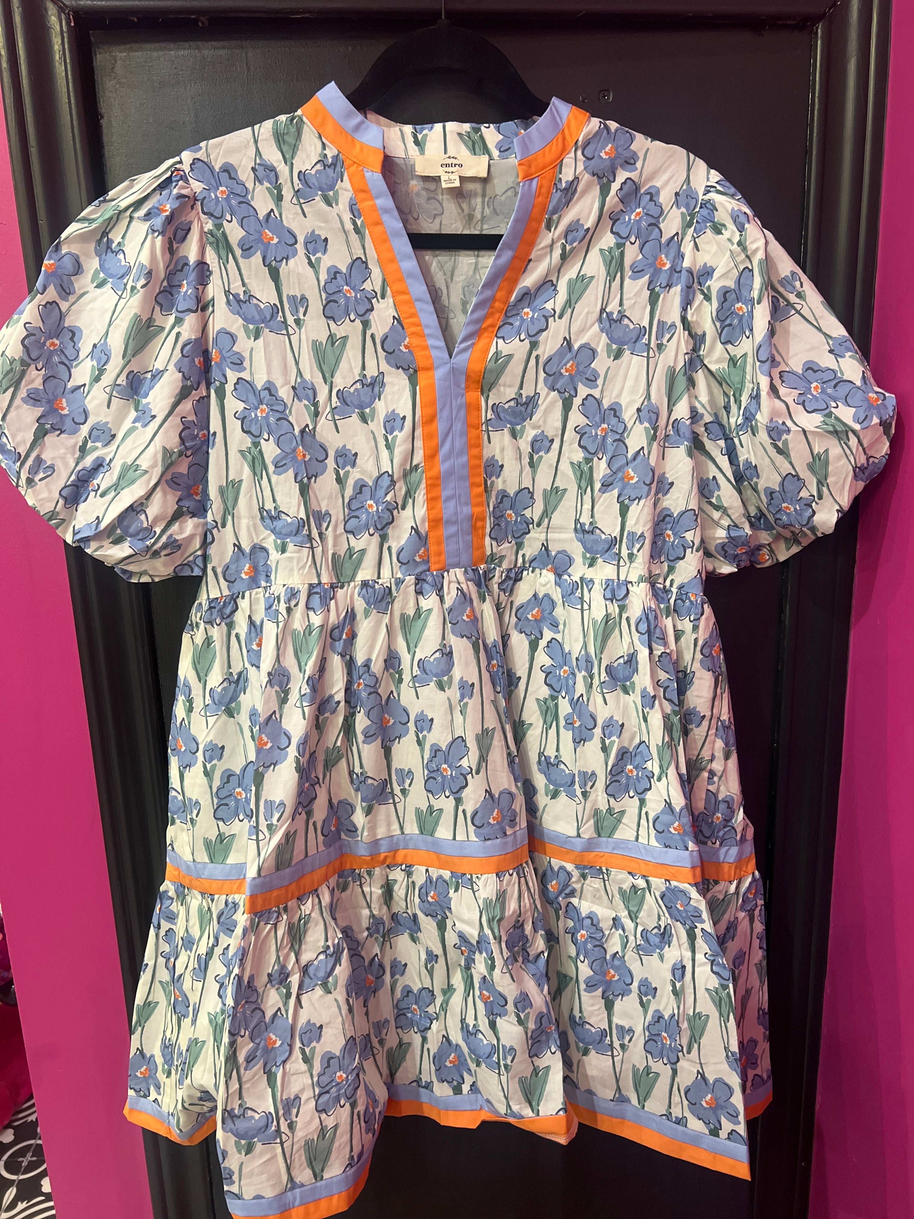 This dress is the perfect balance of bold and beautiful! Featuring a stunning blue floral pattern with vibrant pops of orange at the V-neck and skirt, it’s full of personality and charm. The puff sleeves add a playful, feminine touch, making it perfect for both casual and dressier occasions. Whether you’re headed to a garden party, brunch with friends, or just out for a sunny day, this dress has you covered for a fun, effortless look that still feels chic. Pair it with sandals or heels to complete the vibe!