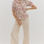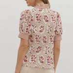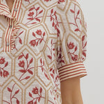 Floral pattern embroidered top featuring striped contrast band short sleeve and front placket button closure. Unlined. Woven. Non-sheer. Lightweight.