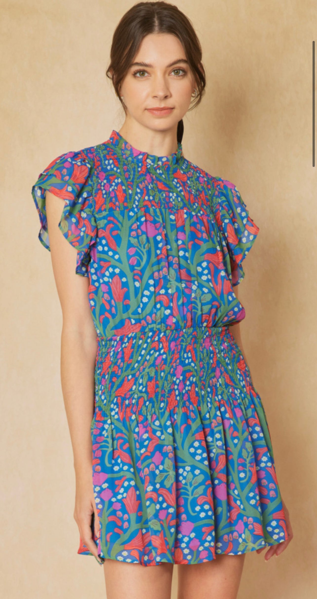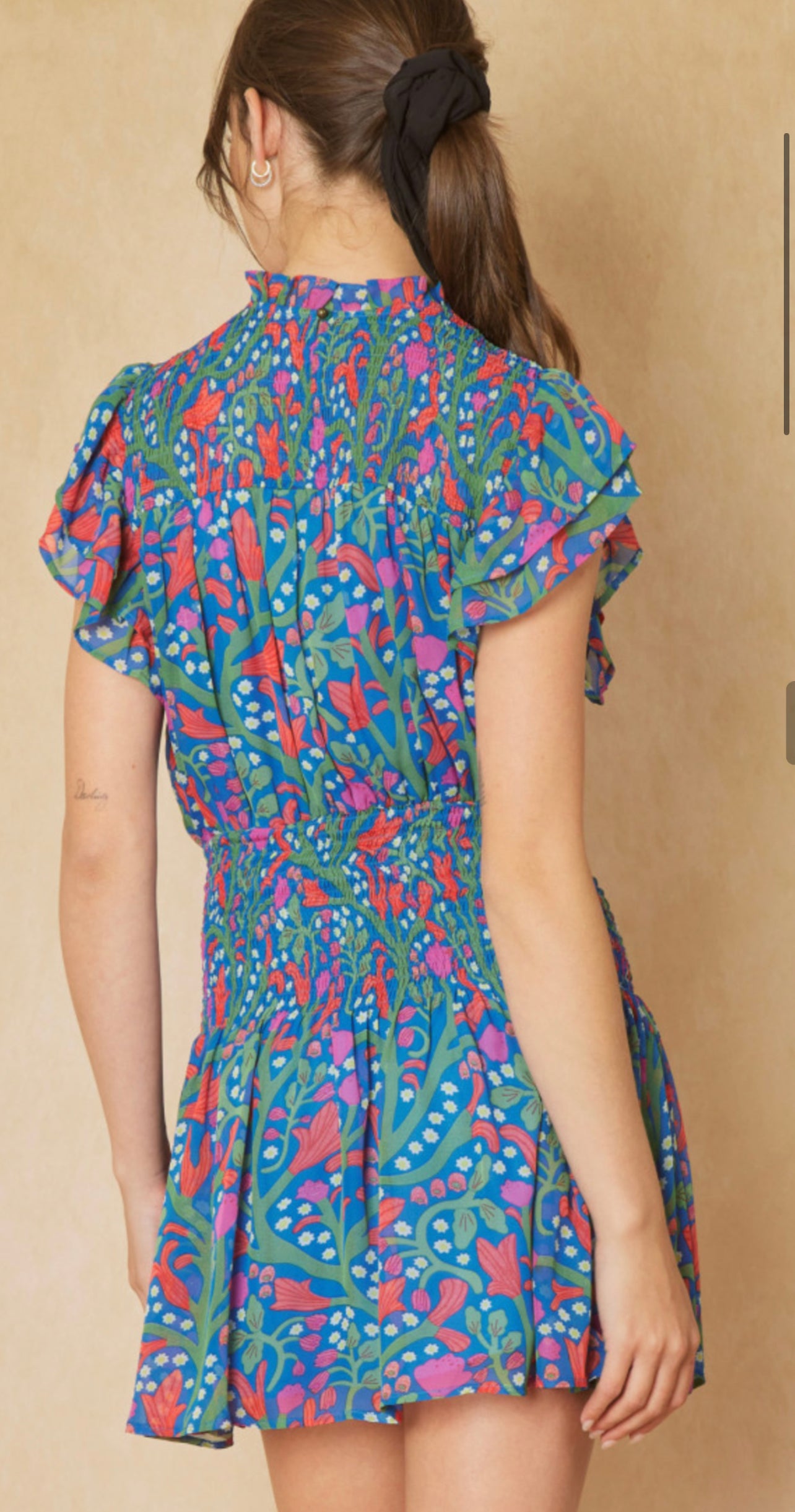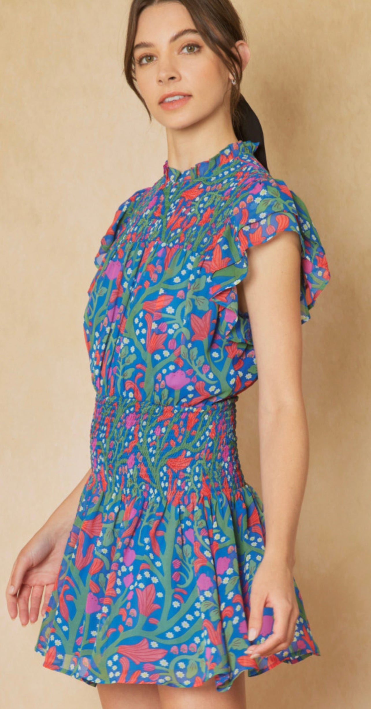 Floral print mock neck ruffle sleeve mini dress featuring smocking at waist and neckline. Keyhole button closure. Lined. Woven. Non-sheer. Lightweight.
