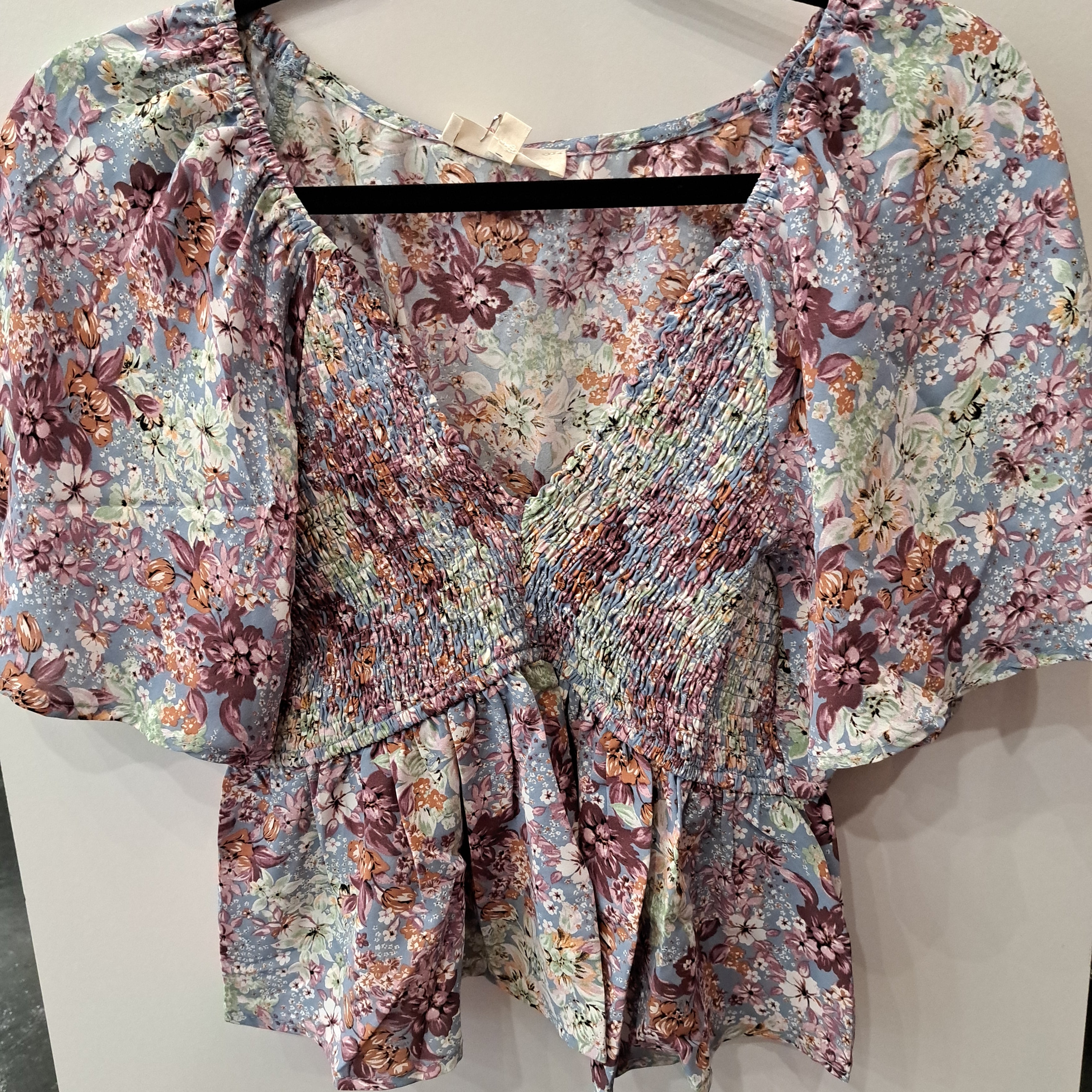 Floral print v-neck peplum cropped top featuring smocking at front. Flutter sleeves. Elastic at shoulders and waist. Unlined. Woven. Non-sheer. Lightweight.