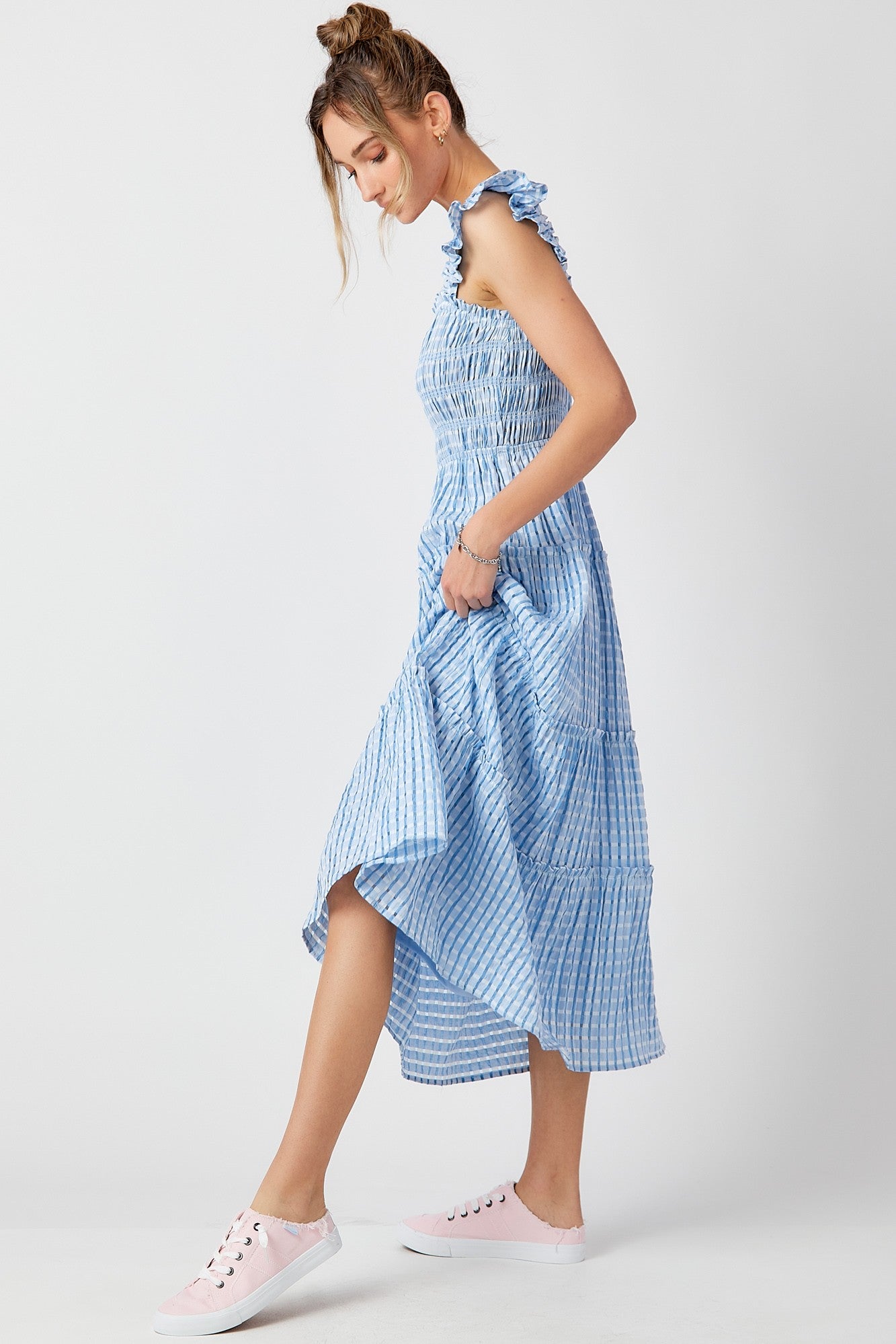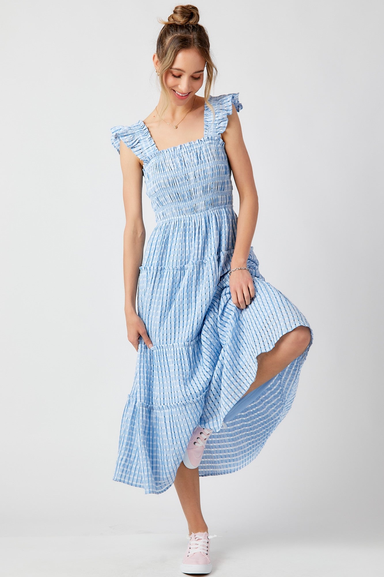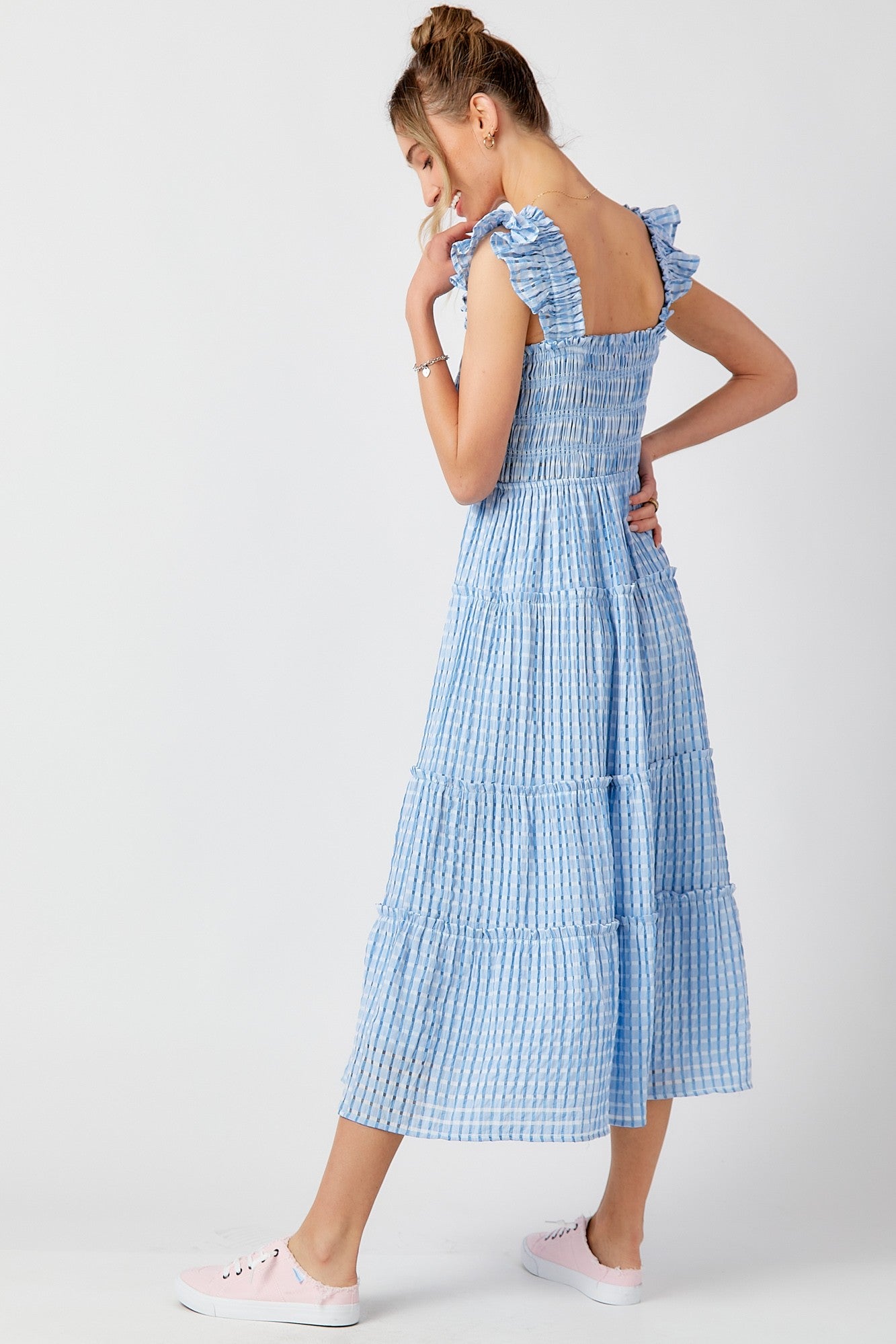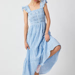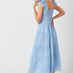 This blue smocked top bodice tiered midi dress is the ultimate mix of fun and feminine! The smocked bodice gives it that perfect, flattering fit while the tiered skirt adds movement and flow as you walk. The ruffle shoulder detailing adds a playful touch that’s totally on-trend without feeling over-the-top. Plus, it’s fully lined, so you don’t have to worry about transparency. Made with unique, fine gingham fabric, this dress brings a classic yet fresh vibe to your wardrobe—perfect for picnics, brunch dates, or any casual outing where you want to look cute but still feel comfy. It’s got that effortlessly chic look that feels like a little bit of summer no matter the season!