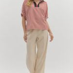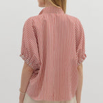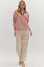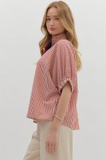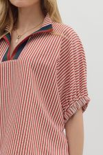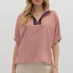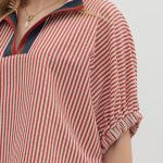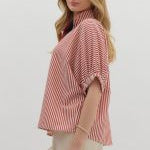 Stripe pattern high neck elasticated sleeve band dolman top featuring accented multicolor rib band split neck. Unlined. Woven. Non-sheer. Lightweight.
