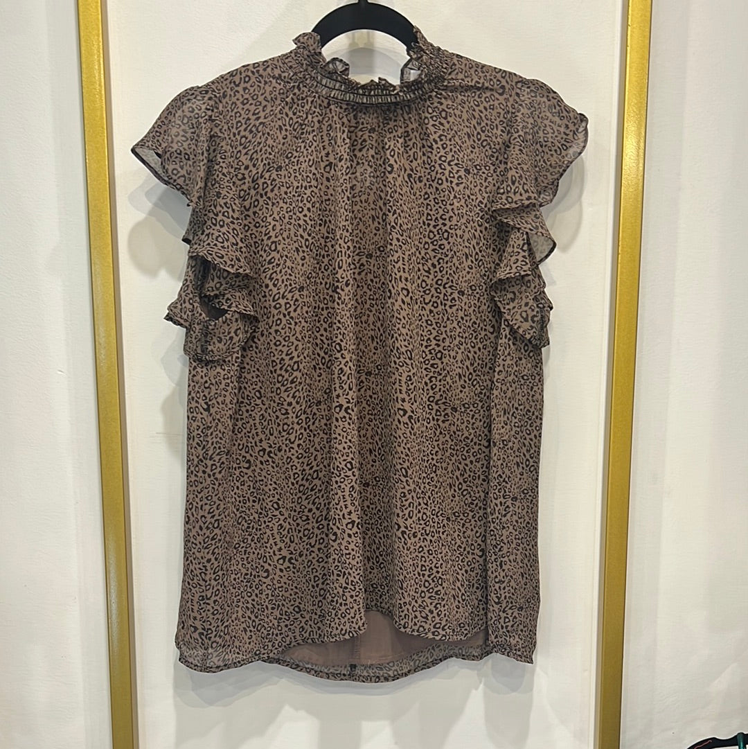 A fierce yet elegant top with an all over cheetah print, smocked neck, pleated neckline, and ruffle sleeves. Finished with a button closure in the back.