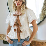 This blouse is the perfect mix of soft elegance and playful charm. The light brown bows at the front add a sweet, subtle contrast, tying it all together in a delicate, feminine way. The puff sleeves give it a touch of vintage flair, adding volume and a bit of drama without being over the top. It’s the kind of top that can effortlessly go from casual to a little dressy, making it a versatile addition to any wardrobe. Perfect for a brunch, a day out, or even something more laid-back yet chic!