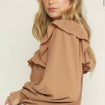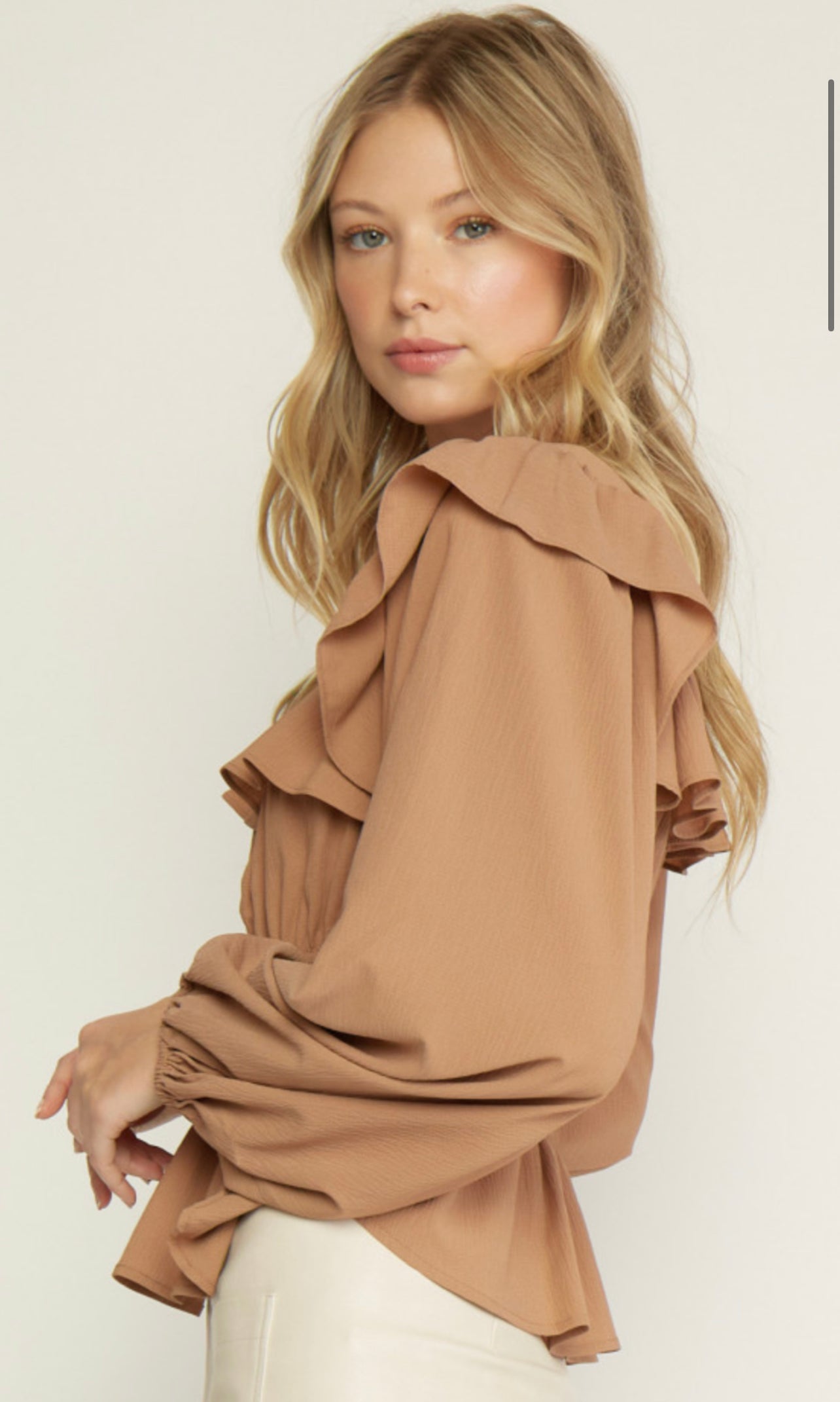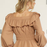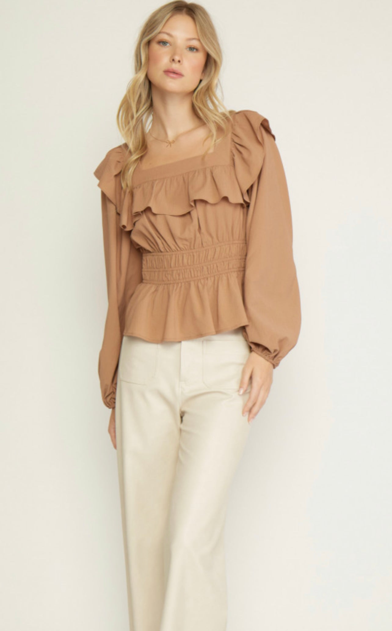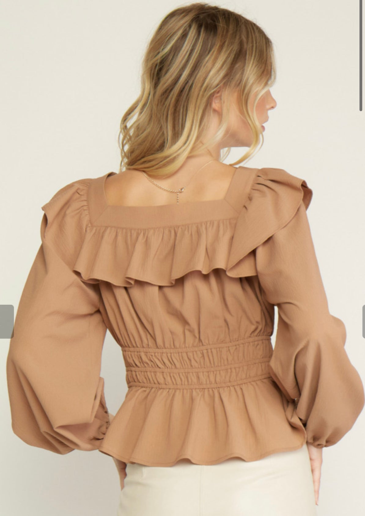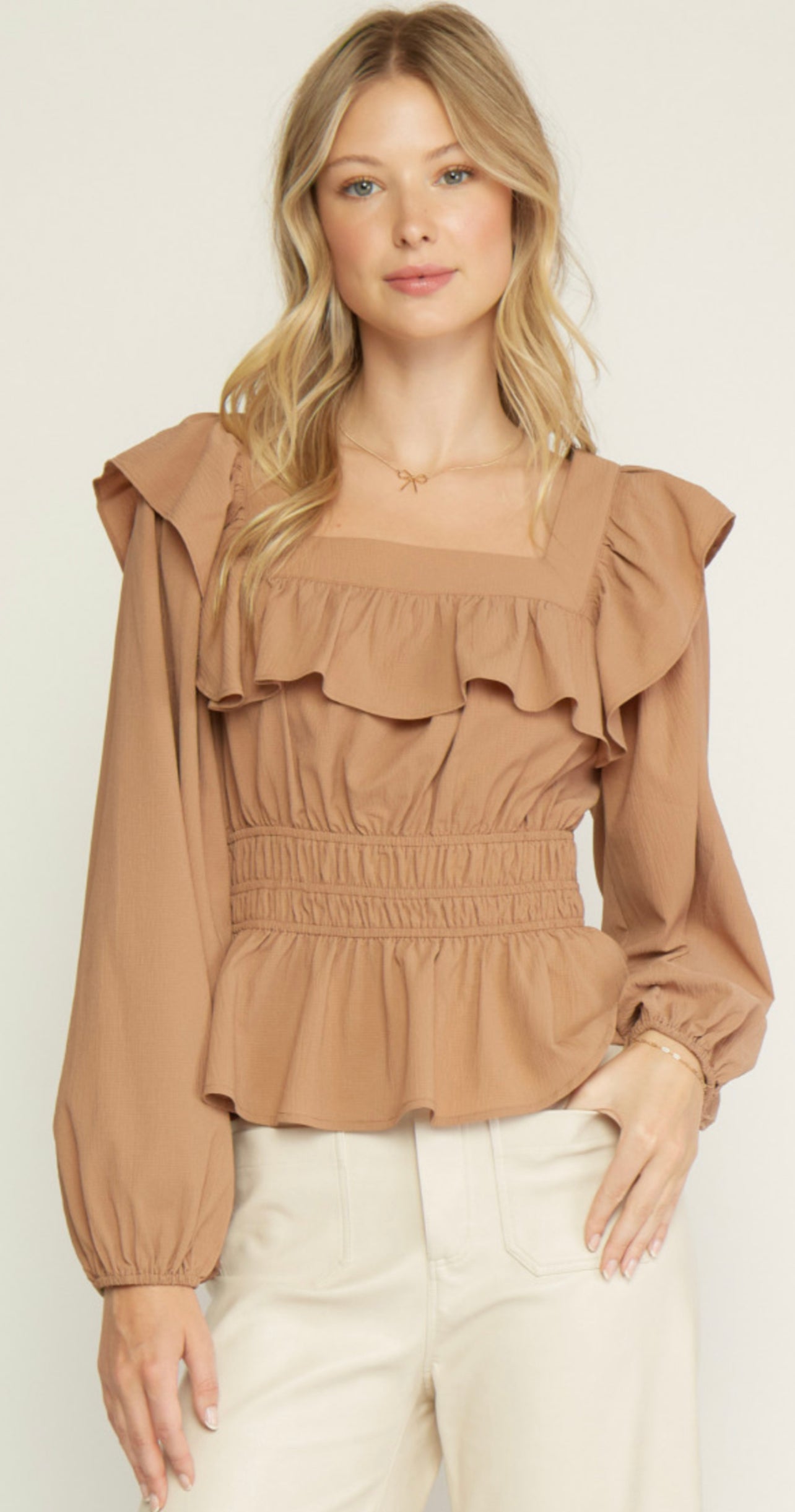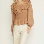 Textured square neck long sleeve peplum top featuring ruffle detail and smocked waist. Unlined. Woven. Non-sheer. Lightweight.