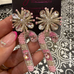 These silver and pink beaded candy cane earrings feature a festive and playful design, perfect for holiday celebrations. Each earring showcases a candy cane shape, intricately crafted with a combination of shimmering white beads and soft pink hues. The pearl beads give the earrings a touch of elegance, while the pink beads add a soft, sweet contrast, reminiscent of peppermint or candy-inspired treats. The beaded design curves to create a delicate yet eye-catching shape, finished with a small, dangling hook for easy wear. These earrings offer a whimsical yet chic accessory, blending holiday cheer with a touch of glamour.