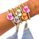 These gorgeous bracelets are handmade with high quality 18k gold filled beads. The Candy hearts are made with colored acrylic and will come in an assortment of the 5 colors pictured! These little babies have a standard size- Fits wrist size 7"-7.5" comfortably!