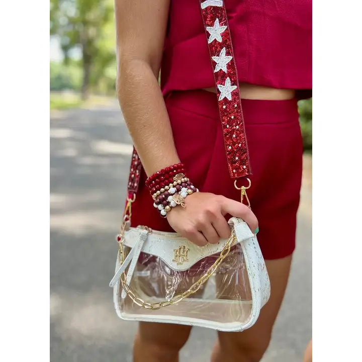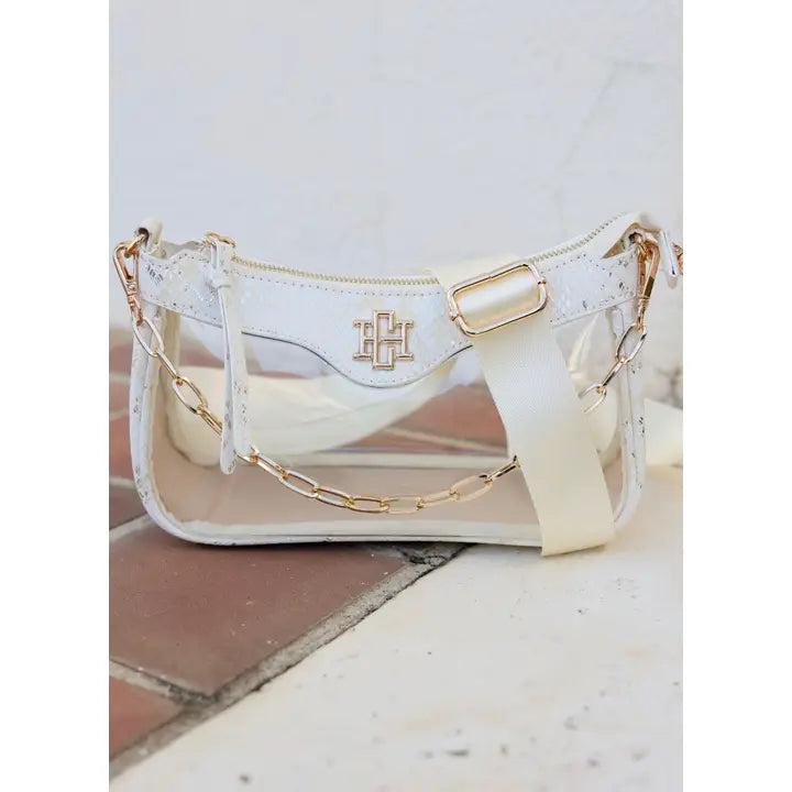 Always be fashionable with this clear crossbody style. It has a clear front and back with vegan leather trim. There is a top zipper closure and an accent removable chain as well. The interior base and sides of the bag are lined with a smooth, cloth material. It also features the Caroline hill logo on the front of the bag. The nylon strap is adjustable and removable as well. Dimensions: 6" tall by 10.5" wide