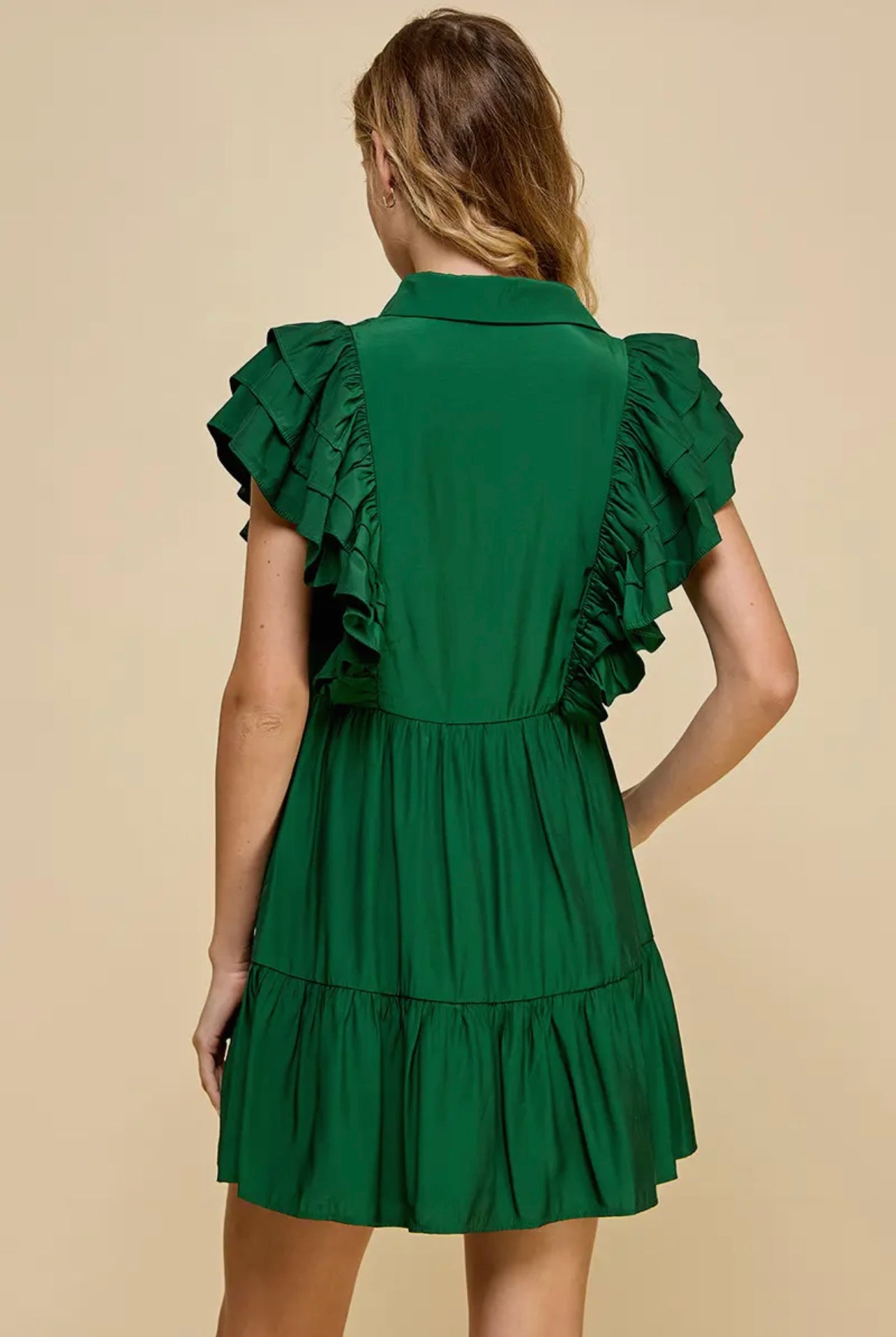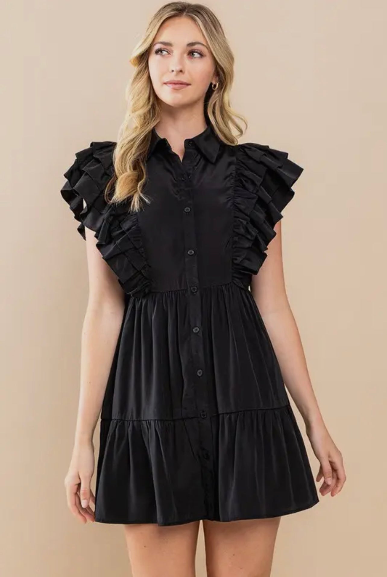 Button down black dress with ruffle sleeves with tiered skirt, very soft to the touch.