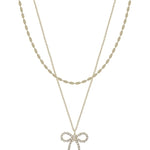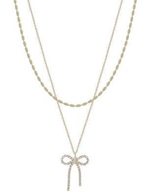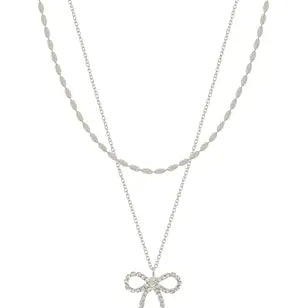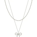 Introducing our captivating chain necklace, featuring the layering of two chains, one with a bow encrusted with gemstones for a touch of sparkle! Whether worn alone as a statement piece of layered with other necklaces for a personalized look, this necklaces effortlessly elevates your style.