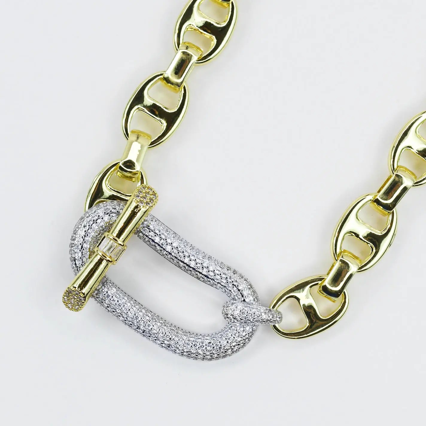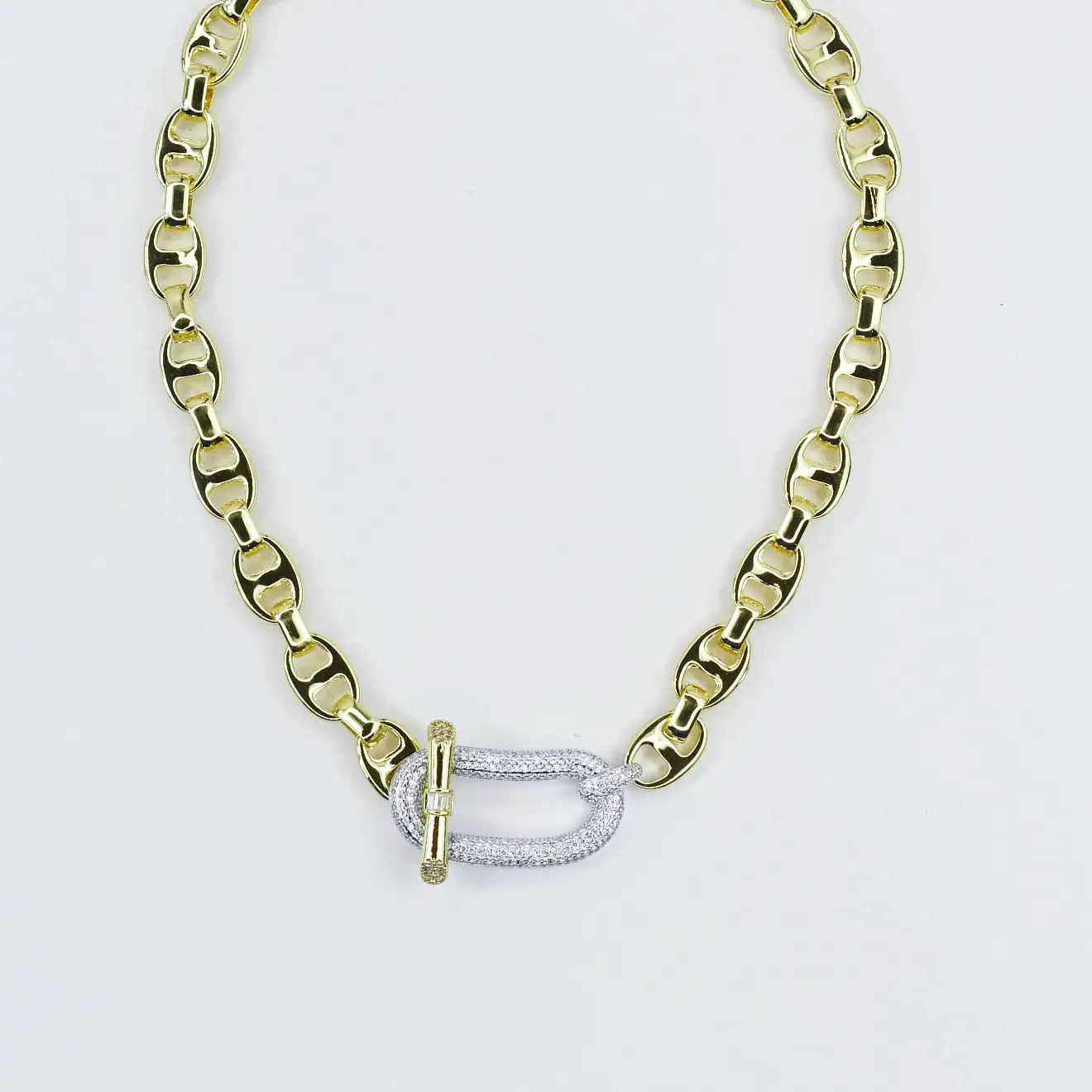 Bold, modern, and effortlessly luxe. * Featuring chunky gold links and a crystal-encrusted clasp, this statement piece radiates confidence and sophistication. Its mixed-metal detail adds a touch of sparkle while keeping the look sleek and versatile. * Perfect for elevating a simple outfit or layering with your favorite chains. * Adjustable fit. * 17 inches + 3 inches extender.