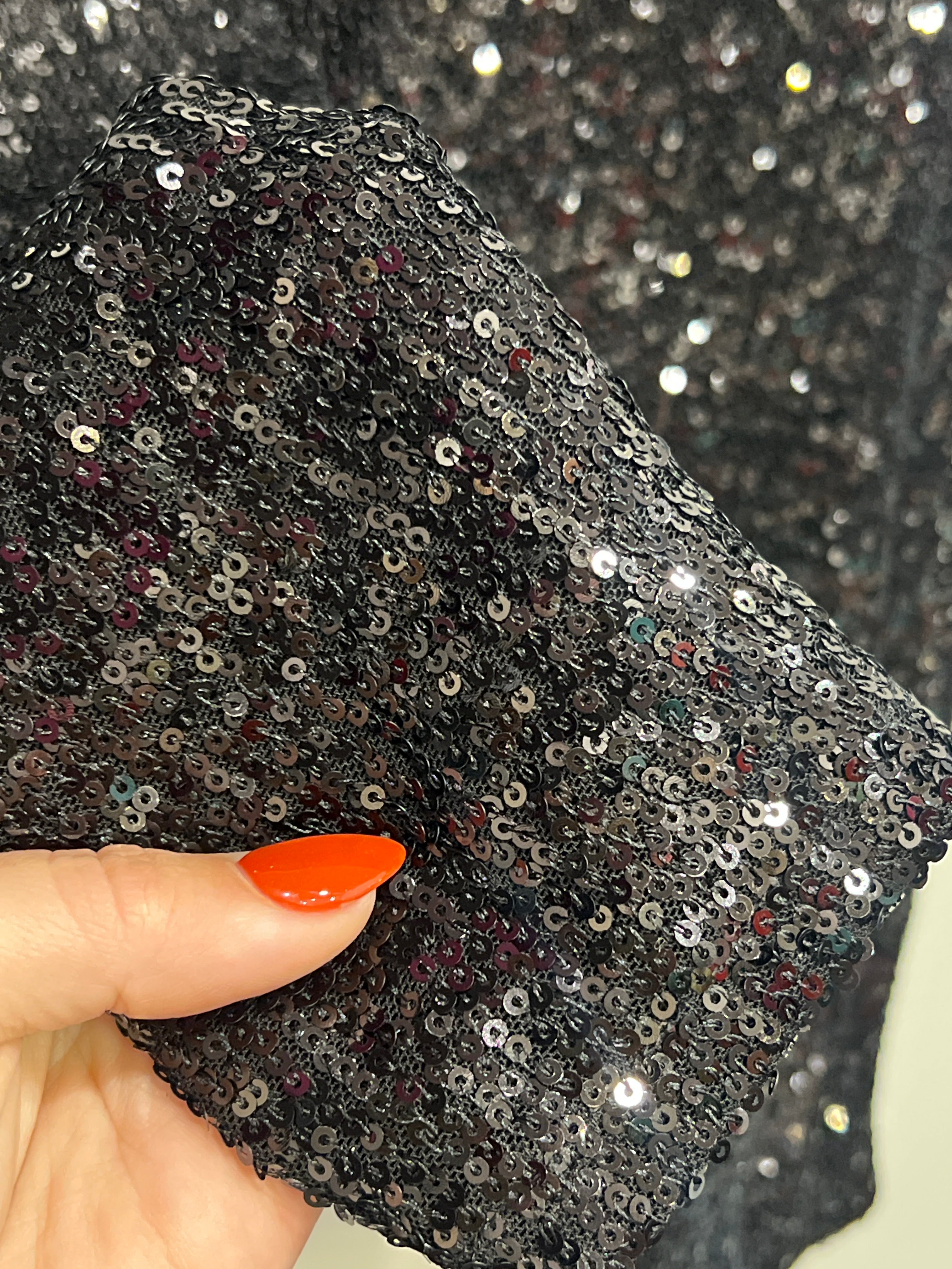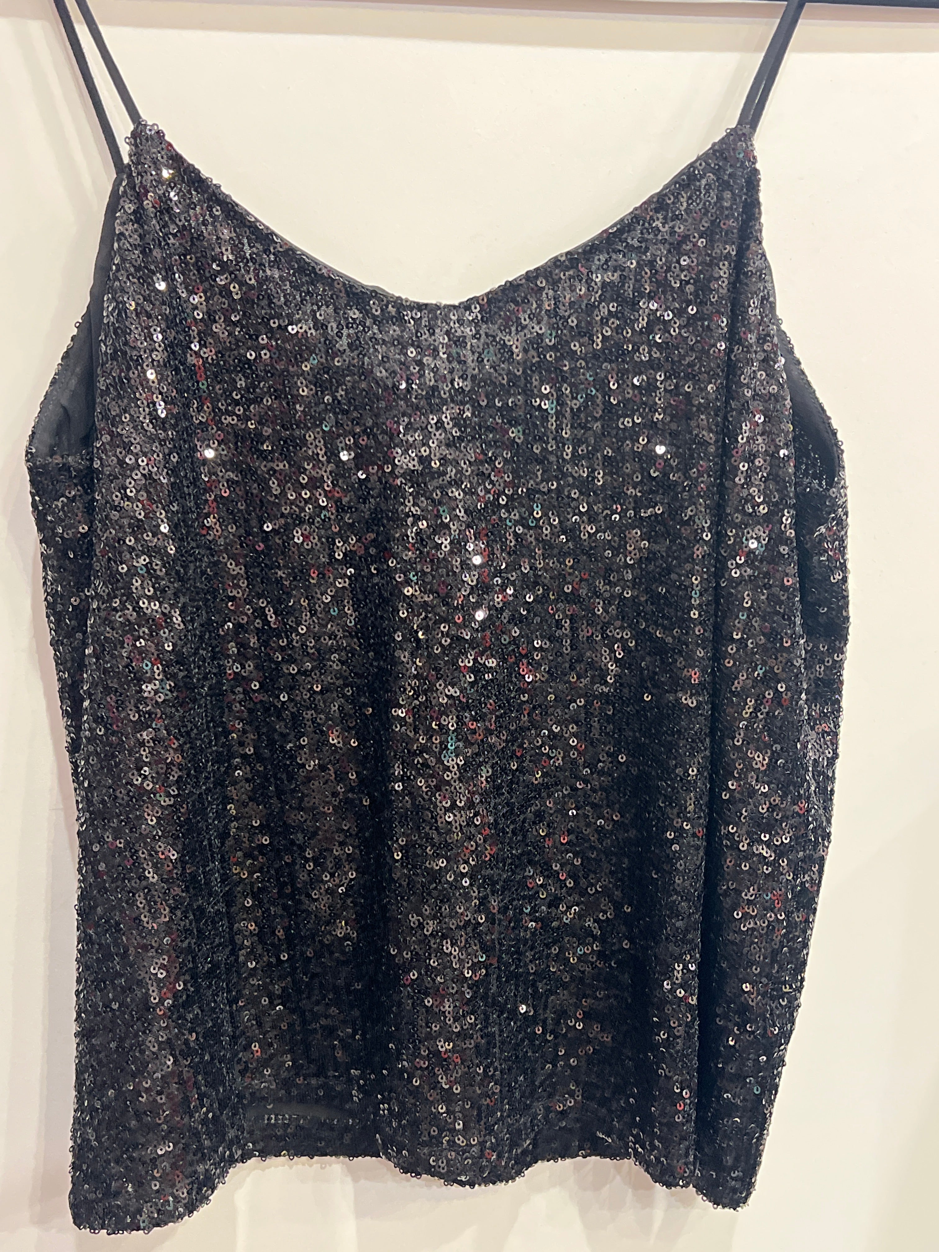 Classic sequin top perfect to pair with a cute pair of jeans or skirt. Beige with silver sequin top made with 95% poly and 5% spandex.