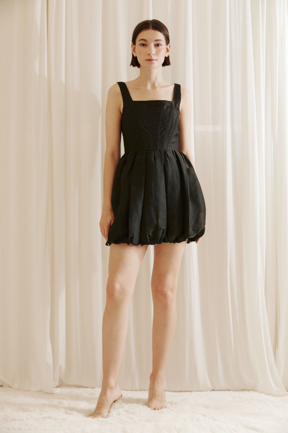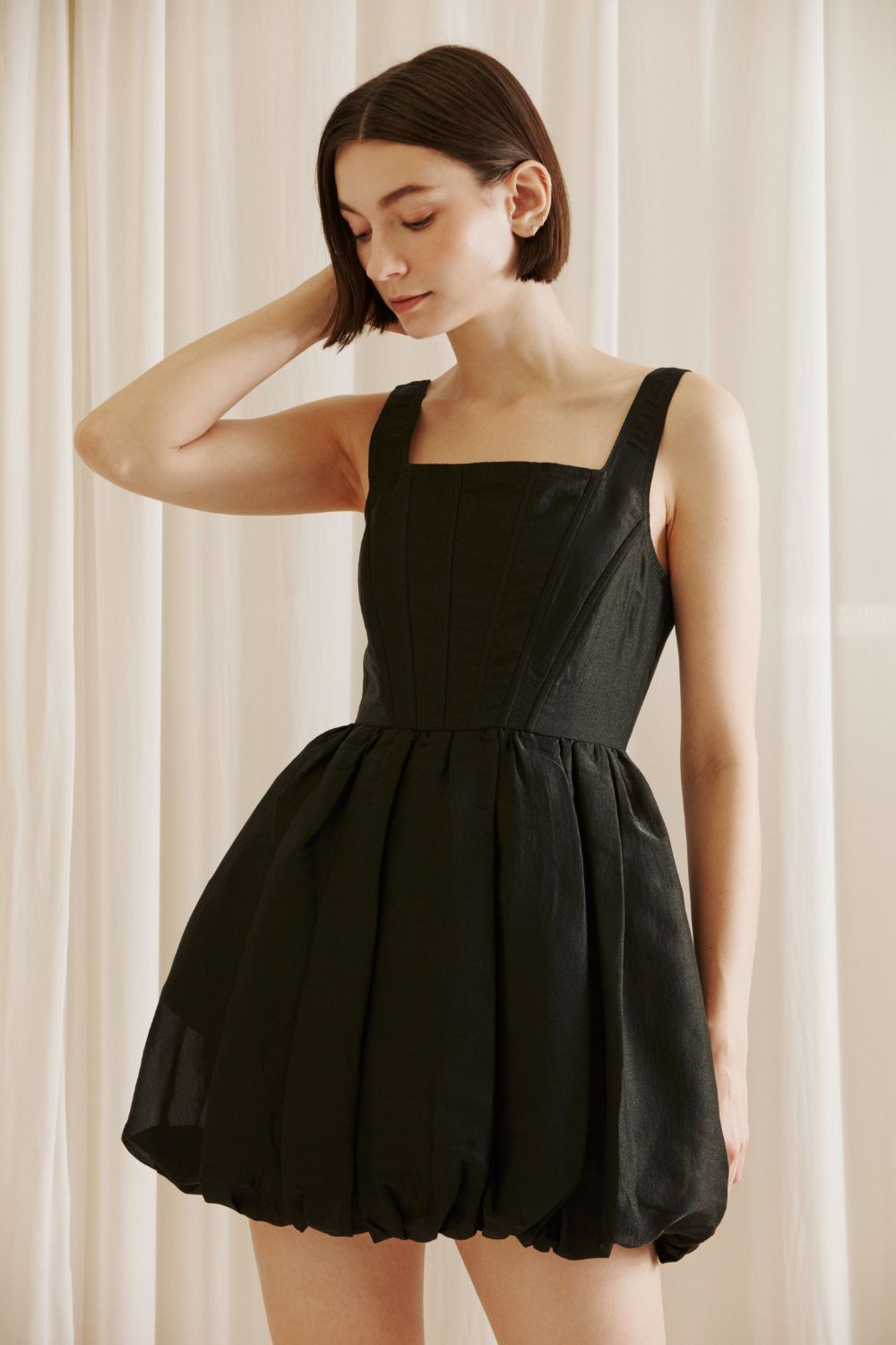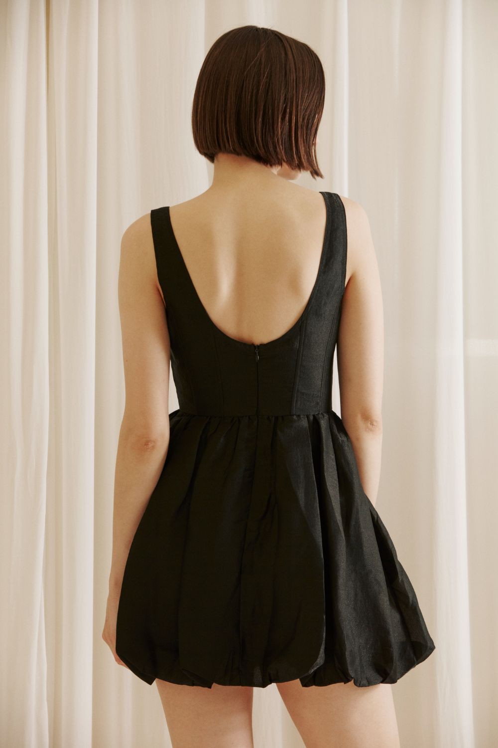 Monochromatic corset A-line mini dress. It exhibits a front square neckline, back U neckline, and tank straps. It also has corset boning, a back invisible zipper, and a gathered hem.