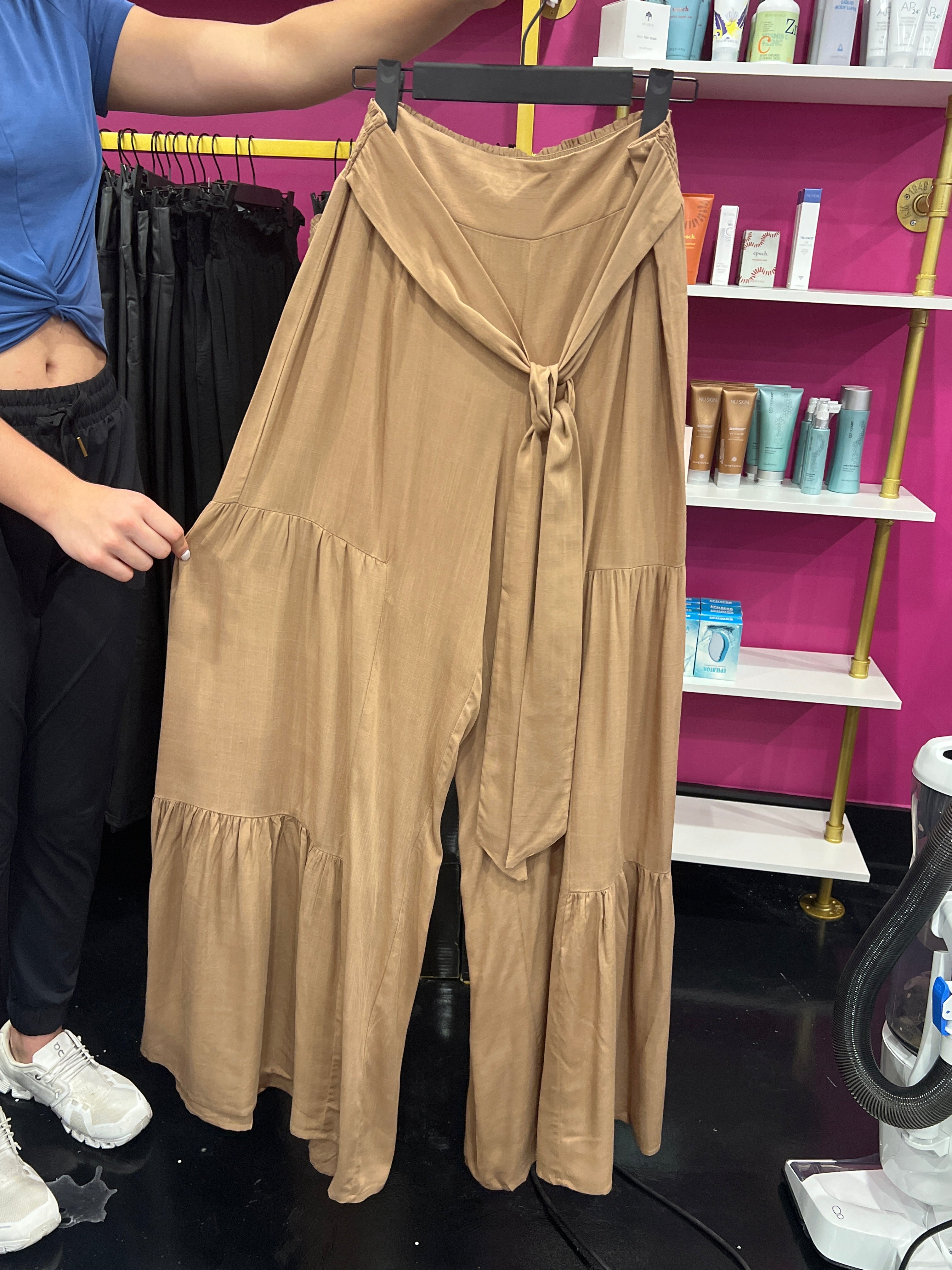 Super swingy wide leg pants with a tiered design protected with a smocked waist and tie.