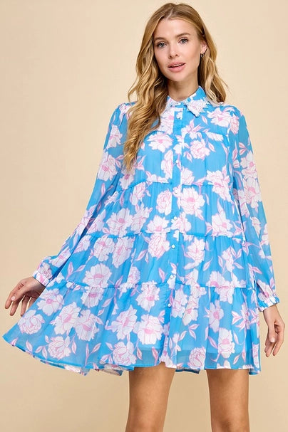 Step into Spring with elegance in this collared shirt dress, dusted in a charming floral print featuring hues of pink and blue. The lace details on the collar adds a touch of sophistication, elevating the overall look!