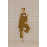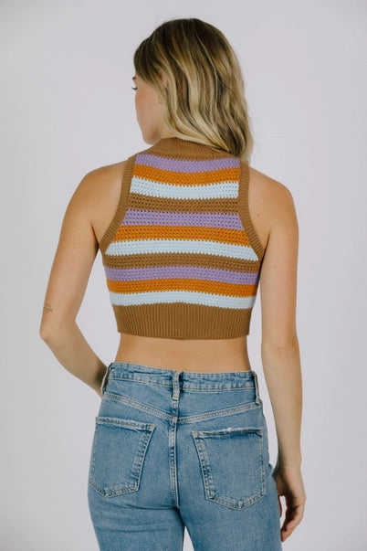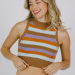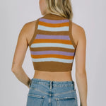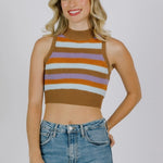This multi-striped color block knit crop top, exhibits a mock neck, sleeveless, ribbed neck, and hem. This piece is perfect for under a sweater on a cozy day, or on a regular day when you want something you won't get too hot in but still has that cozy feel.