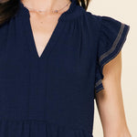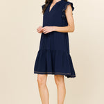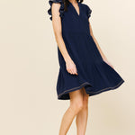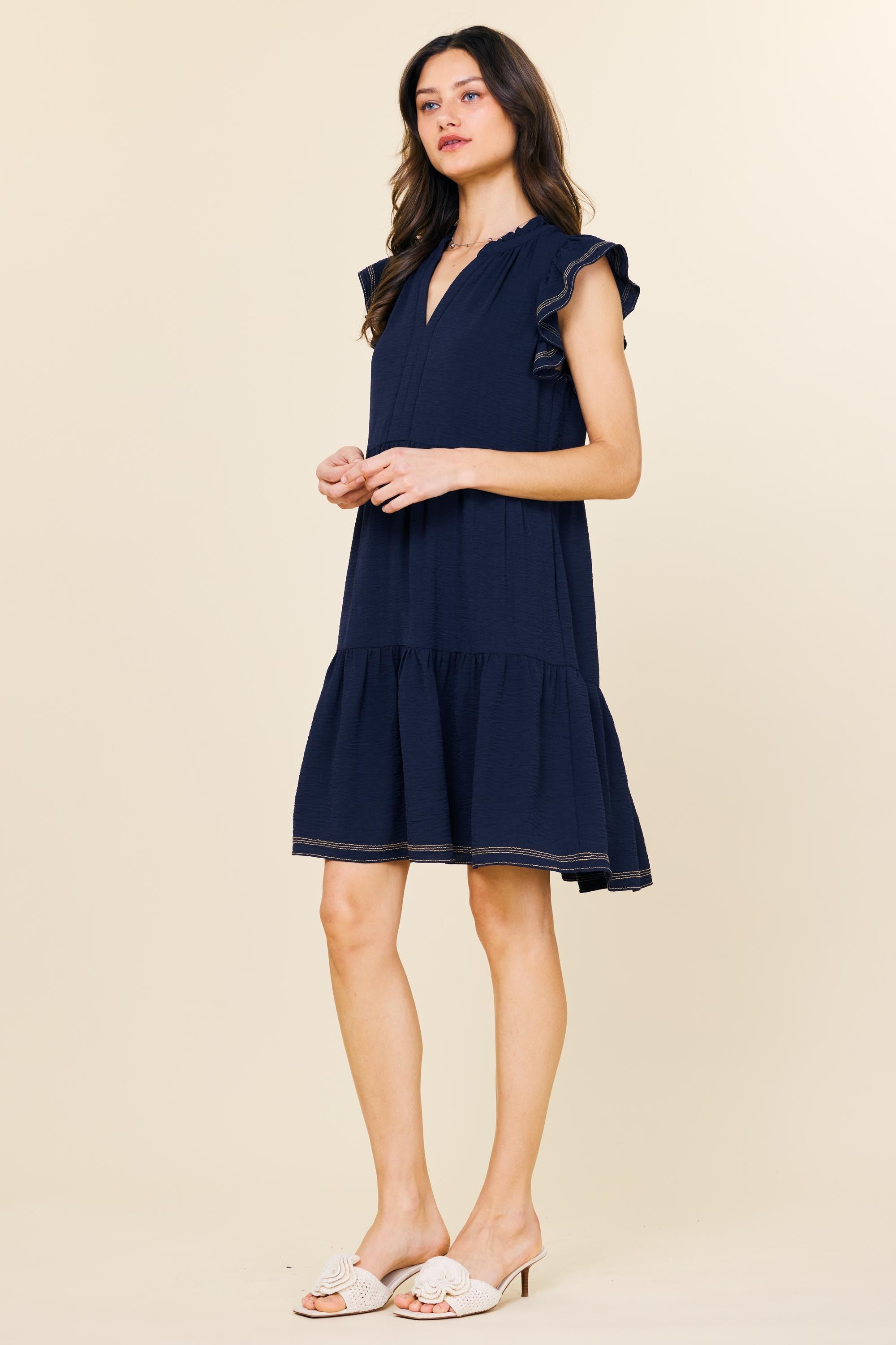 Sweet with a modern twist, this tiered babydoll dress features bold contrast stitching that adds structure and edge to its playful silhouette. Designed with a relaxed fit and soft tiers for easy movement, it's the perfect blend of casual charm and contemporary style. Whether dressed up with heels or down with sneakers, this lightweight dress is a standout for any season.