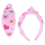 Dazzle with a touch of sparkle with this Conversation Hearts on a vibrant Pink Knotted Headband! This fashion headband for women is more than an accessory, it's a statement. Adorned with sequin conversation hearts, it adds a playful yet sophisticated touch to any outfit.