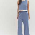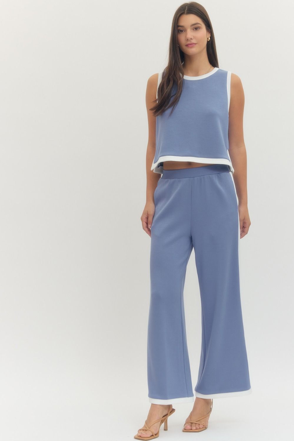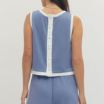 Solid sleeveless knit top featuring contrast binding and covered button closure at back. Side slit detail. Unlined. Knit. Non-sheer. Lightweight.