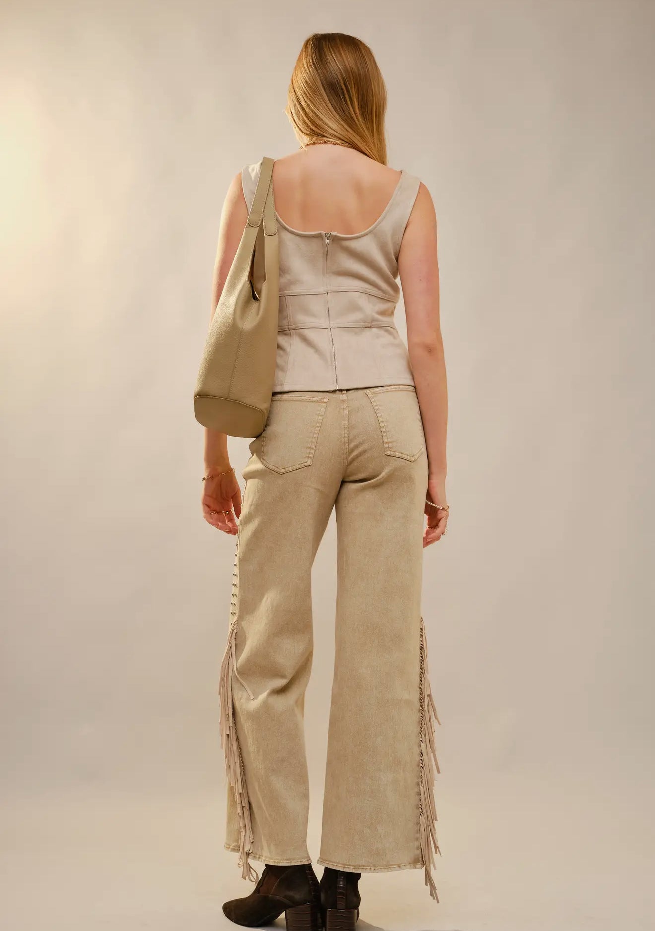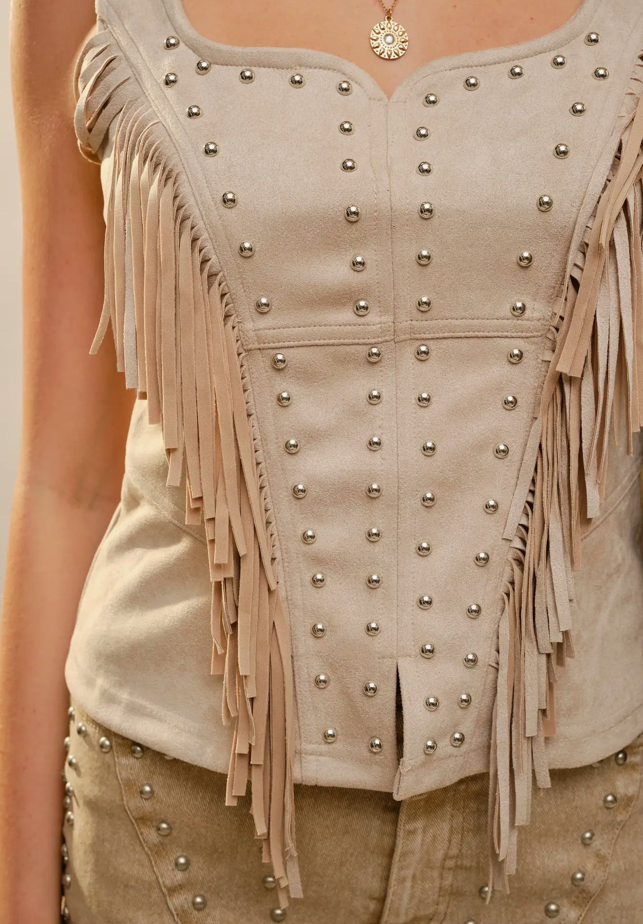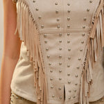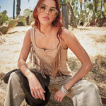 Channel effortless western glam in our Desert Dream Fringe Faux Suede Corset Top. Designed in a soft faux suede fabric, this statement piece features cascading fringe and shimmering stud accents for the perfect blend of boho and cowgirl-chic.
