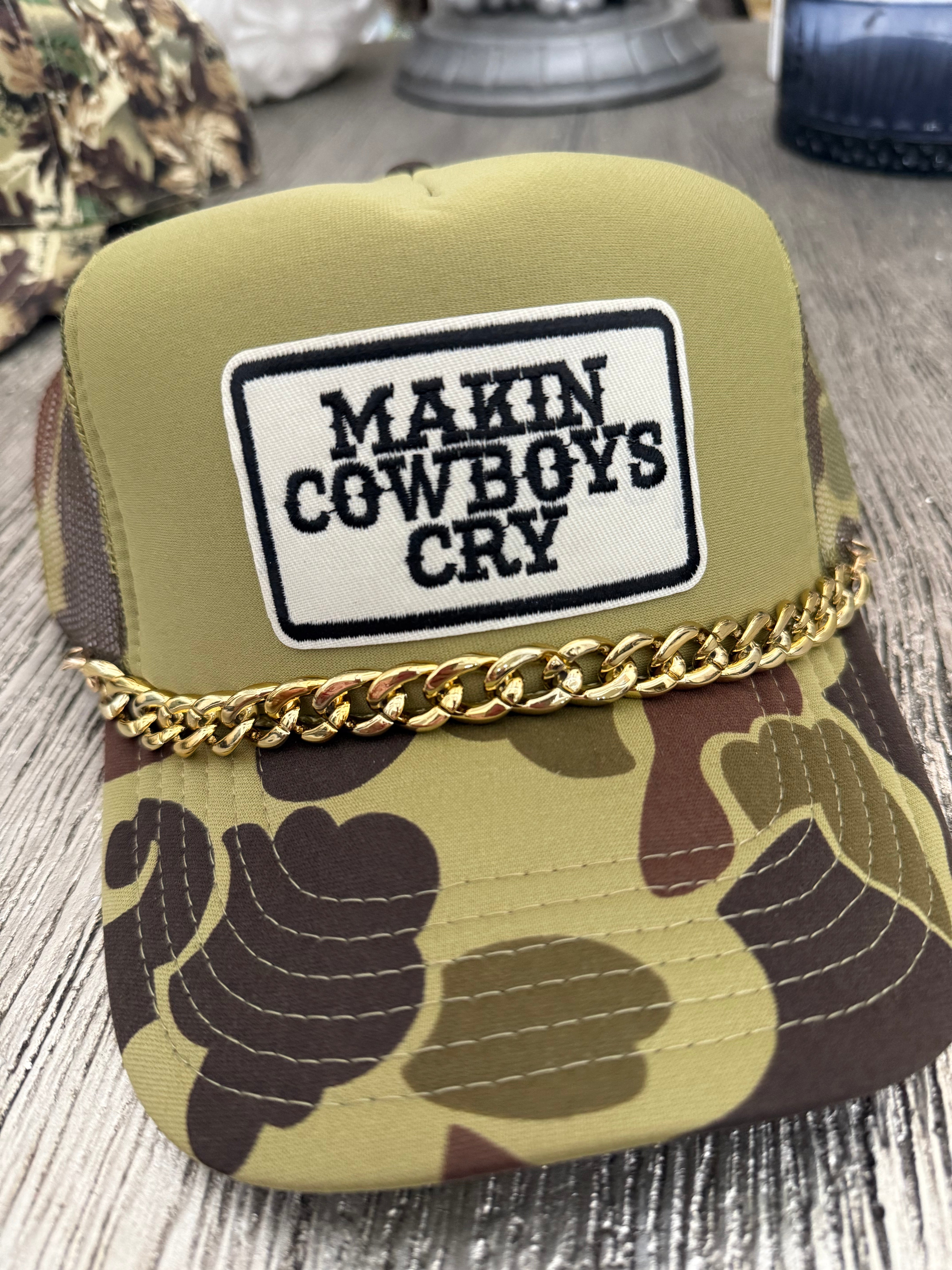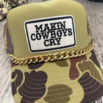 The Makin Cowboys Cry Trucker Hat is a statement! This Otto brand trucker hat, with its attached chain, adds a unique touch to any outfit. This hat is not just an accessory, but a unique piece.