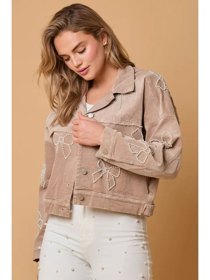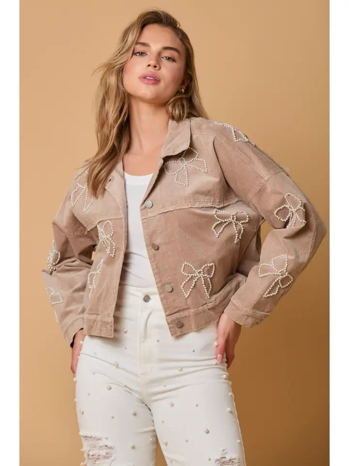 What really sets this jacket apart is the adorable pearl bow embellishments. They add a dash of elegance and a hint of whimsy, making this jacket perfect for dressing up your everyday look. With long sleeves for added warmth and style, it's a versatile piece that can effortlessly elevate any outfit, whether you're heading to work or out for a casual day with friends.
