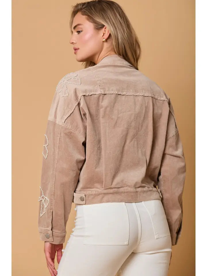 This corduroy jacket with Pearl Bow has that cozy, vintage feel of corduroy fabric, giving it a rich texture and warmth. The collared design adds a touch of sophistication, while the front button-down closure makes it easy to layer over your outfits.