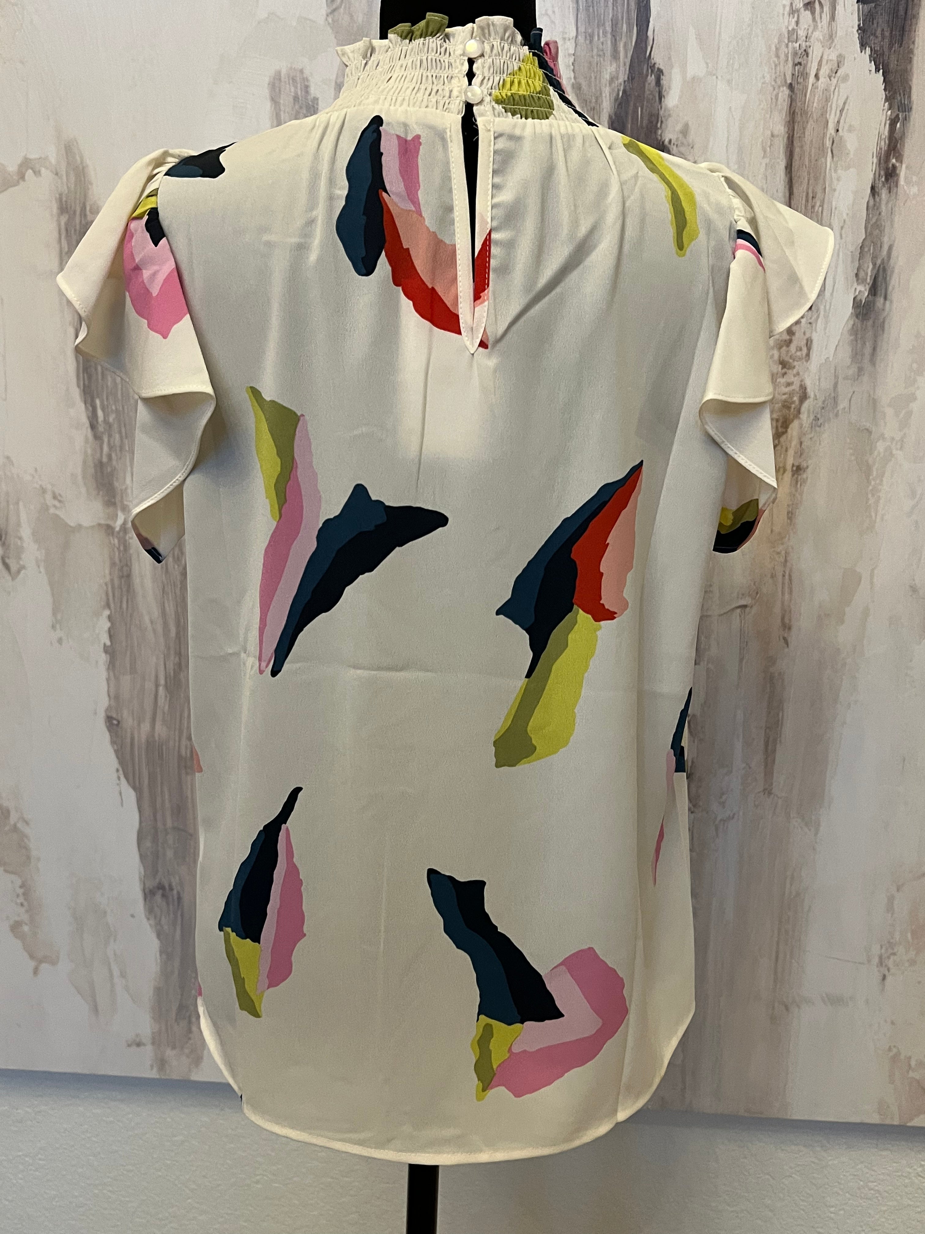 CREAM FLUTTER SLEEVE SMOCKED NECK TOP