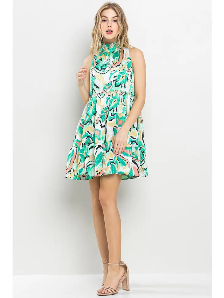 Spring printed dress featuring high neckline, ruffle retail and back hidden zipper. Model Size + Fit: Model height: 5'9" Dress size: 2 Bust: 33 Waist: 25 Hips: 34