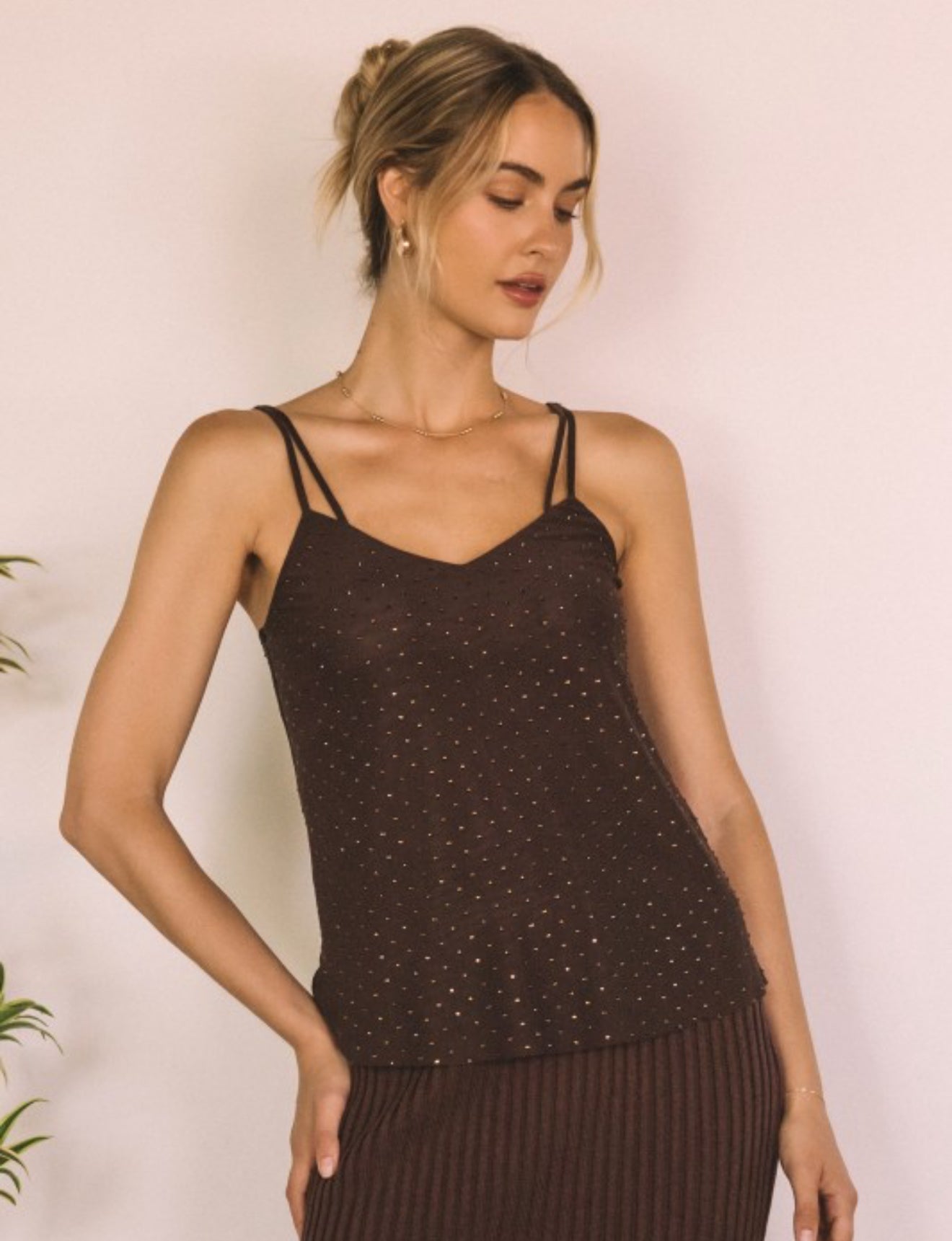 Shine bright with effortless style in our Crystal Glow Tank. Designed with a flattering V-neckline and delicate double straps, this cami is covered in sparkling crystals that catch the light from every angle. Made with a soft, stretchy fabric, it blends comfort with glam—perfect for day-to-night looks.