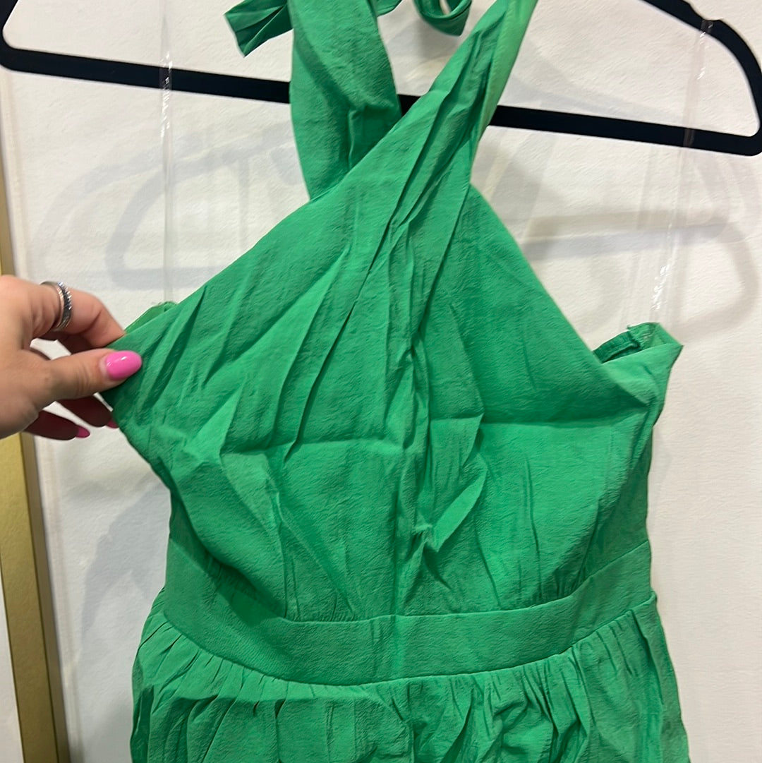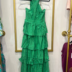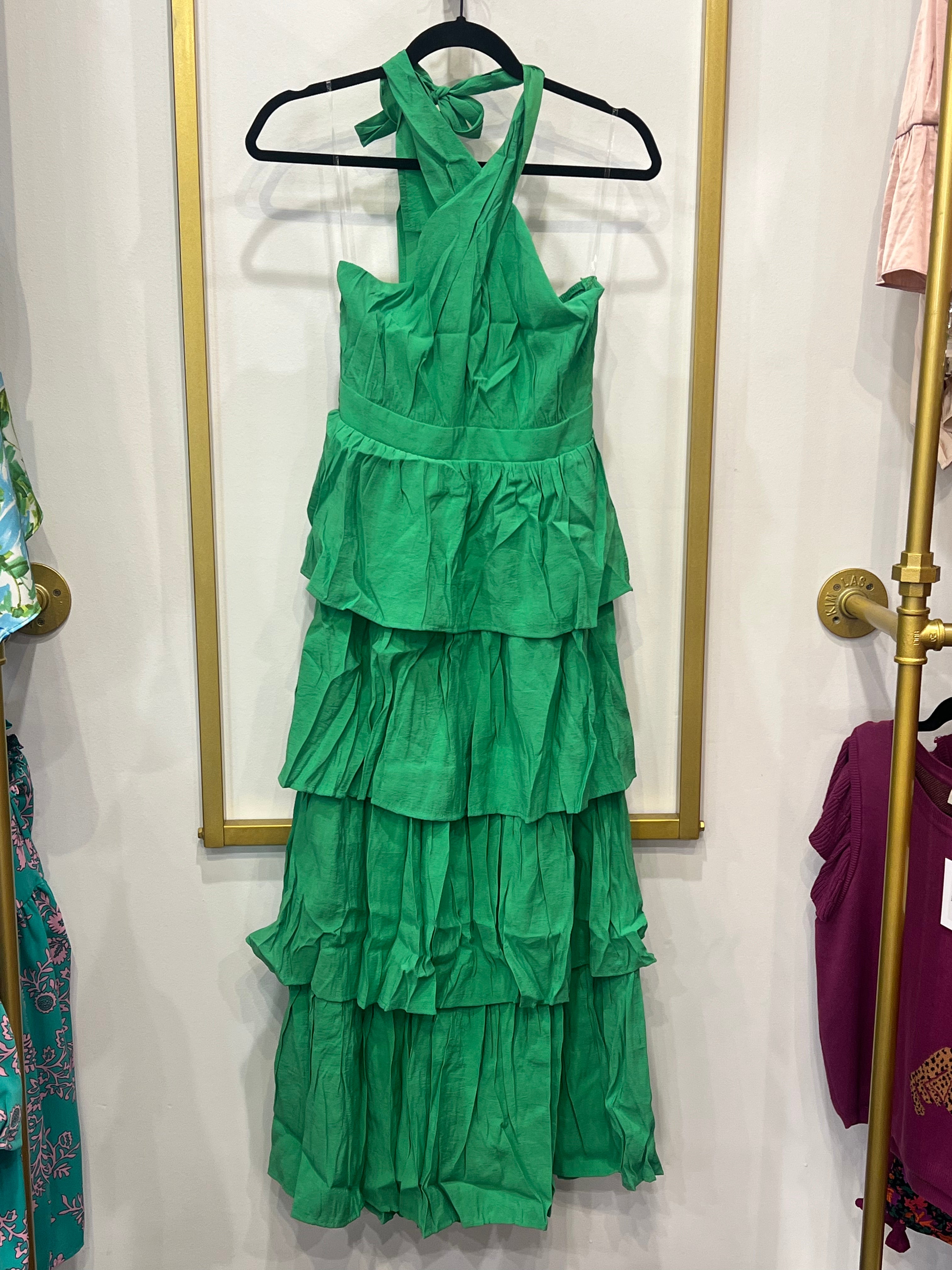 This dress combines elegance and comfort effortlessly. The vibrant green of the dress is sure to catch the eye, with the halter top draws attention to the shoulders and neckline, while the tiered skirt cascades gracefully, adding movement and flow to every step.