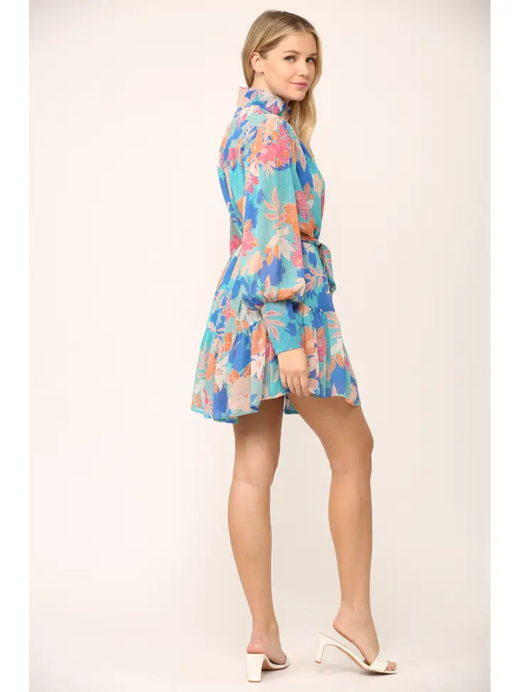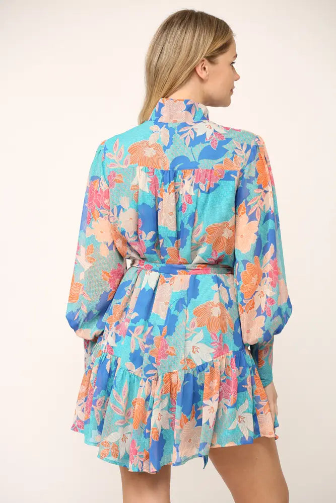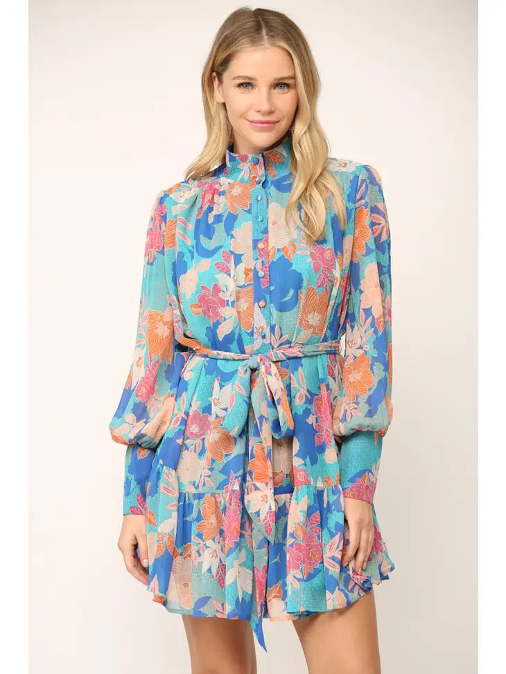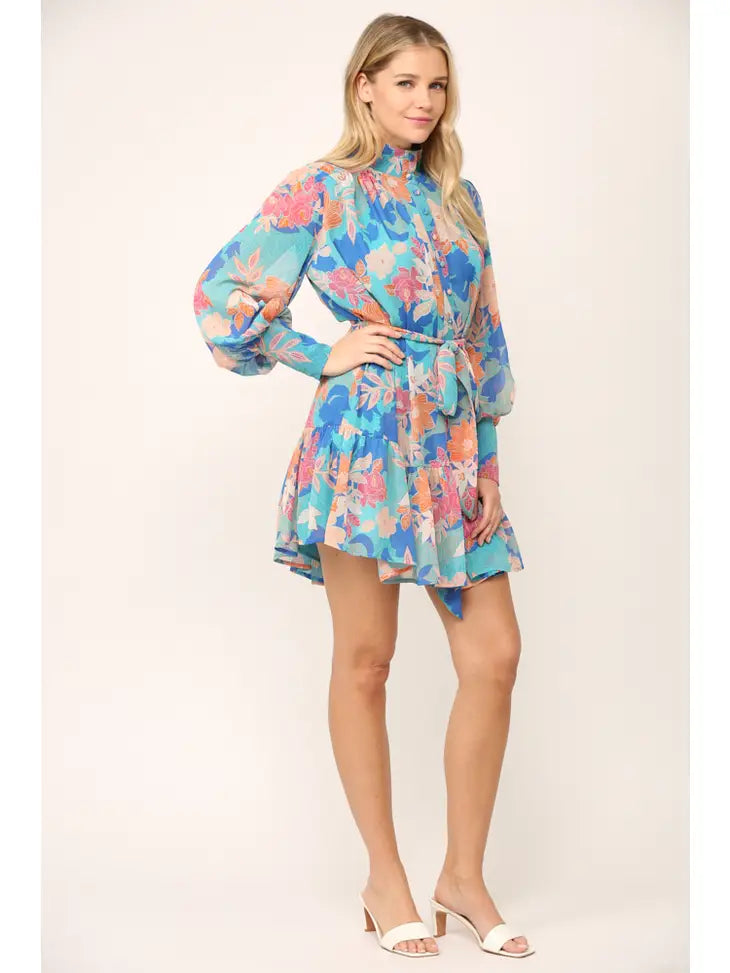 Floral print chiffon mock neck tie waist ruffle dress S:100%poly L:100%poly