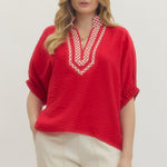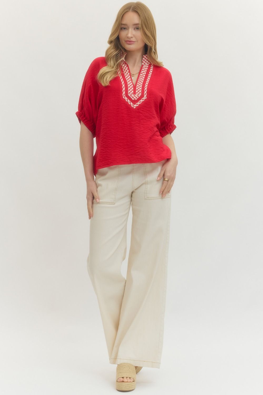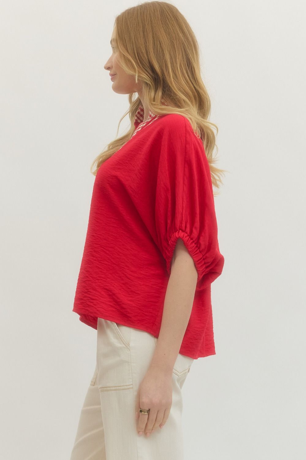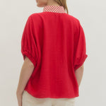Solid short raglan sleeve top featuring contrast gingham V-neck panel and stand collar. Elasticated cuffs. Unlined. Woven. Non-sheer. Lightweight.