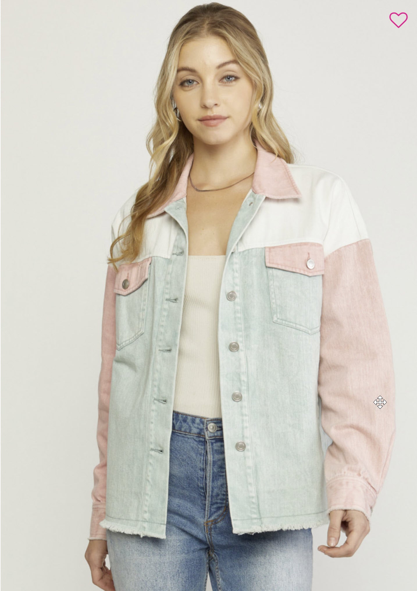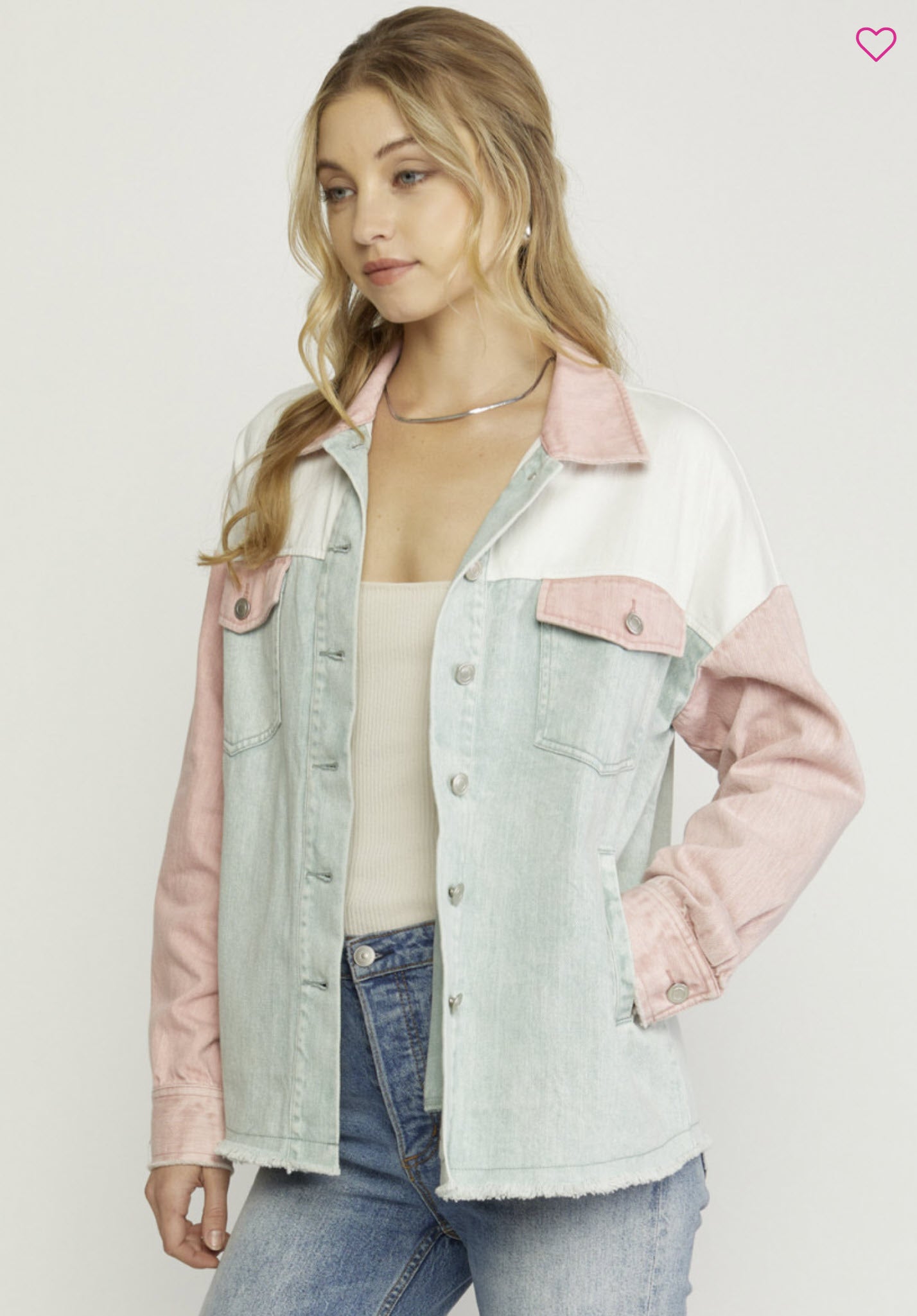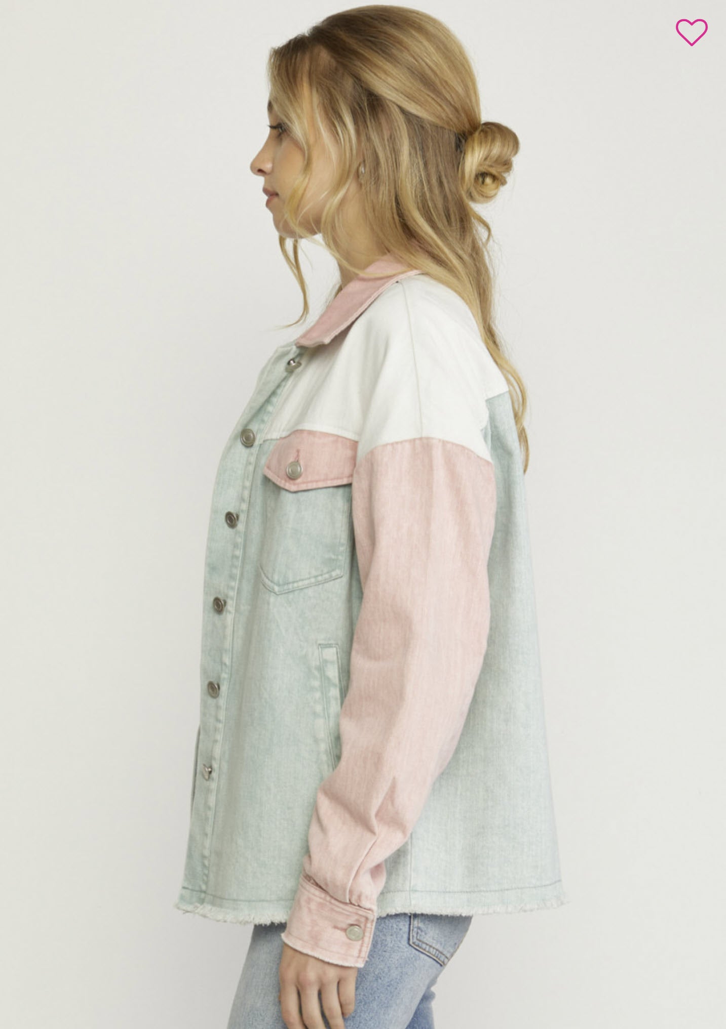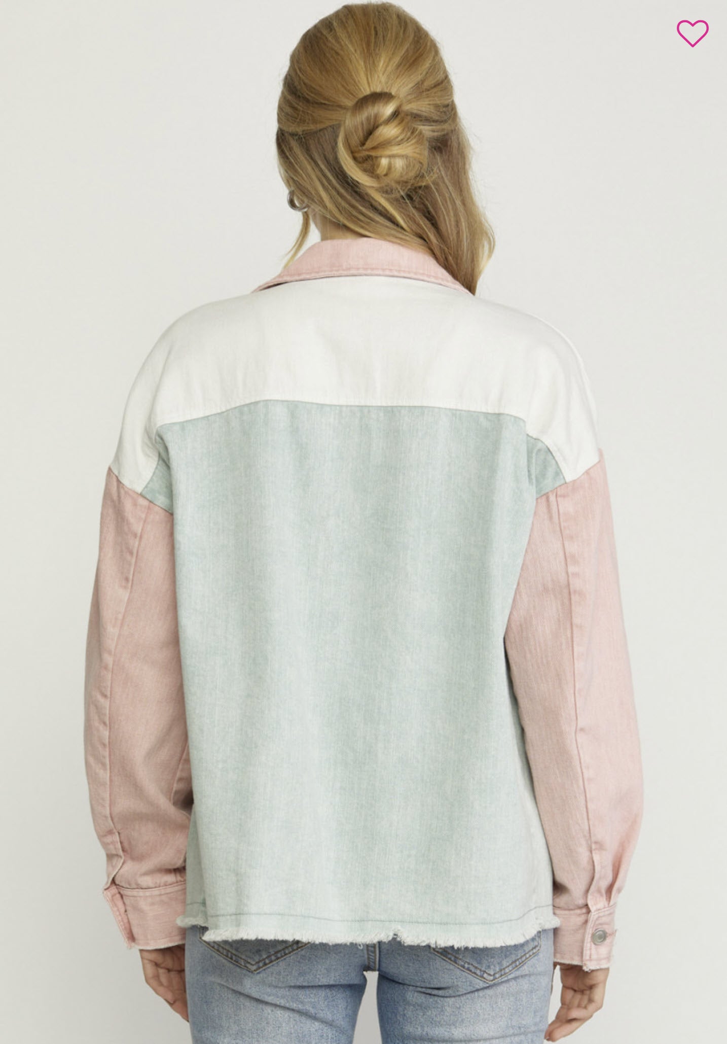 Denim color block long sleeve button down jacket featuring pockets at bust and sides. Button closure at wrists. Freyed hems. Unlined. Woven. Non-sheer. Mediumweight.