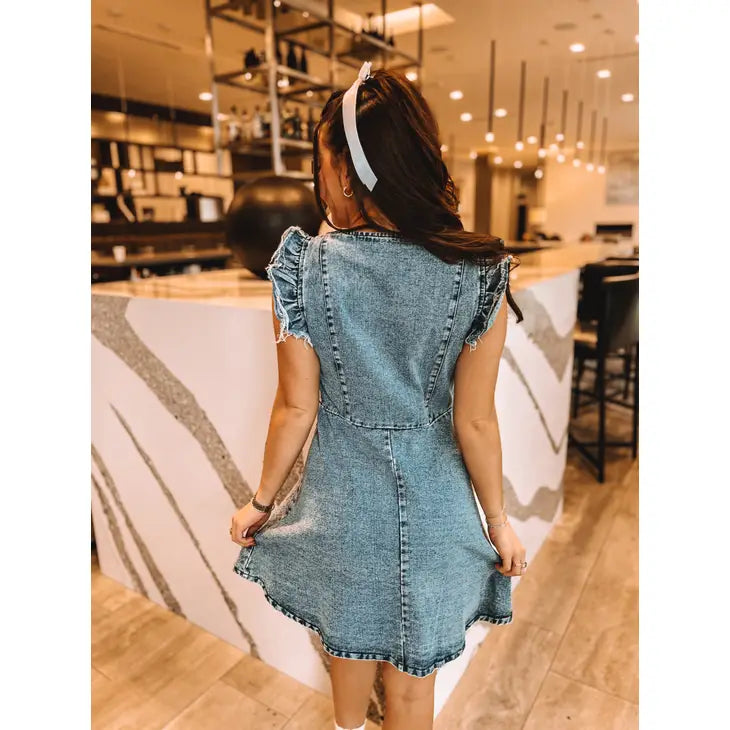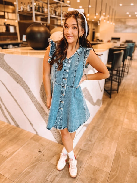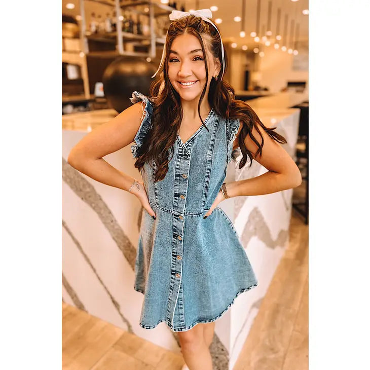 All the cute denim has us in a daze! This adorable and super flattering dress features an A-line skirt that is not too short or too long. Perfect for layering or wearing with our white bloom sandals this Spring/Summer!