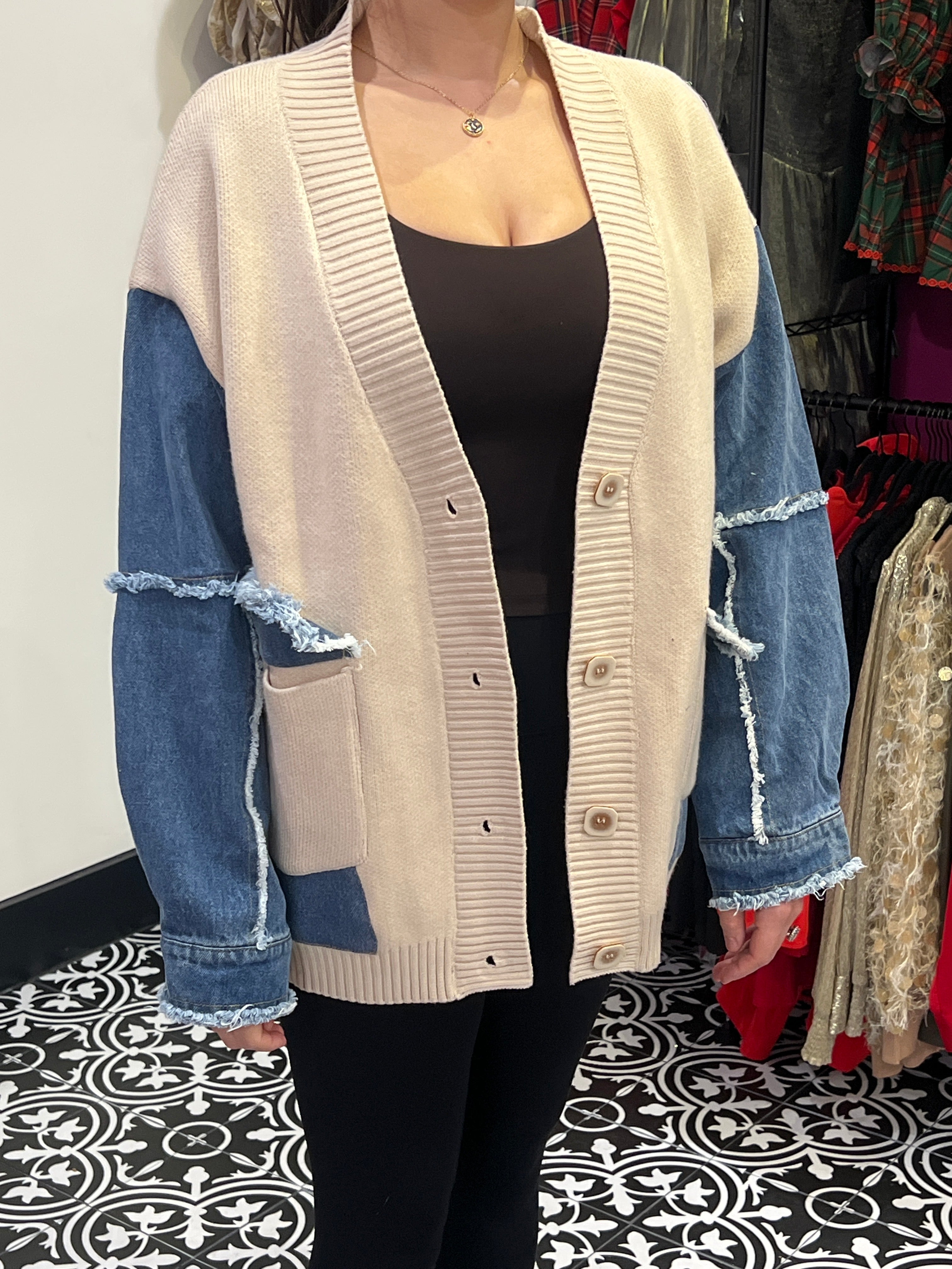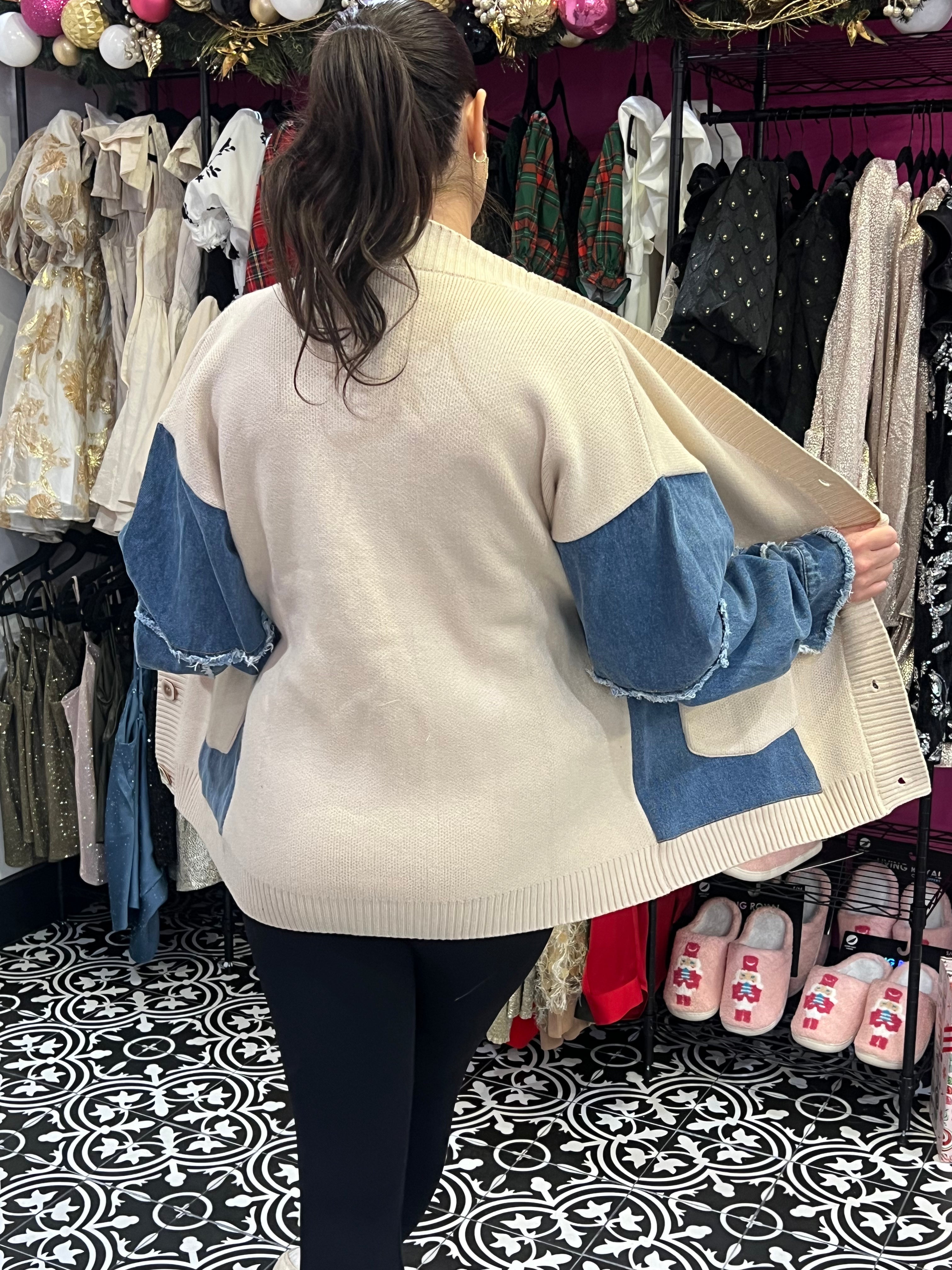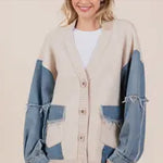 This denim and knit color block cardigan is the perfect blend of casual comfort and trendy style. With a cool mix of denim fabric and soft, cozy knit! The relaxed fit and button-down design make it easy to throw on over any outfit, adding warmth and style without being too heavy. Whether you're pairing it with jeans for a laid-back vibe or dressing it up with a skirt, this cardigan is the versatile layering piece your wardrobe needs.